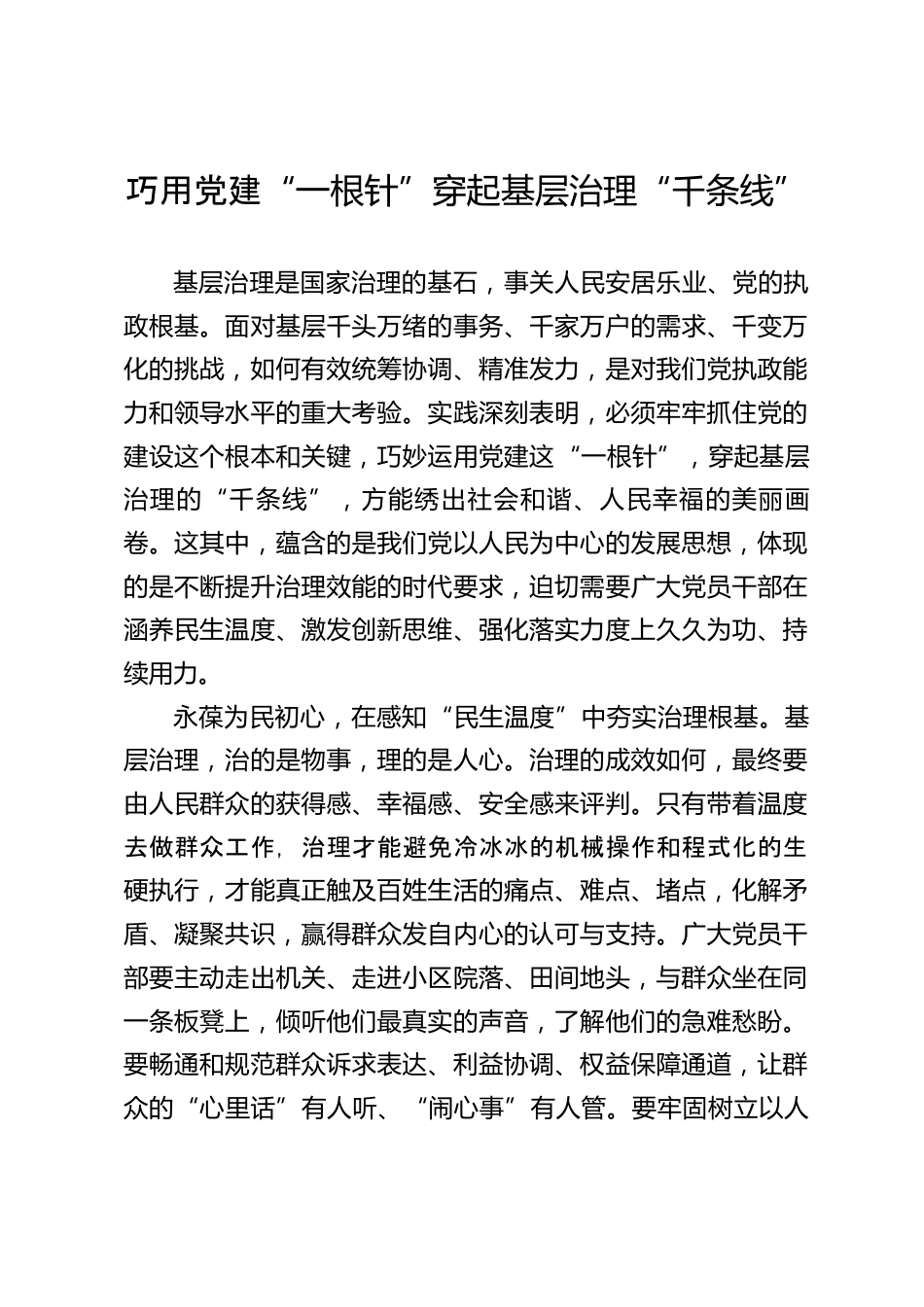 巧用黨建“一根針”穿起基層治理“千條線”基層治理是國(guó)家治理的基石,事關(guān)人民安居樂業(yè)、黨的執(zhí)政根基。面對(duì)基層千頭萬緒的事務(wù)、千家萬戶的需求、千變?nèi)f化的挑戰(zhàn),如何有效統(tǒng)籌協(xié)調(diào)、精準(zhǔn)發(fā)力,是對(duì)我們黨執(zhí)政能力和領(lǐng)導(dǎo)水平的重大考驗(yàn)。實(shí)踐深刻表明,必須牢牢抓住黨的建設(shè)這個(gè)根本和關(guān)鍵,巧妙運(yùn)用黨建這“一根針”,穿起基層治理的“千條線”,方能繡出社會(huì)和諧、人民幸福的美麗畫卷。這其中,蘊(yùn)含的是我們黨以人民為中心的發(fā)展思想,體現(xiàn)的是不斷提升治理效能的時(shí)代要求,迫切需要廣大黨員干部在涵養(yǎng)民生溫度、激發(fā)創(chuàng)新思維、強(qiáng)化落實(shí)力度上久久為功、持續(xù)用力。永...