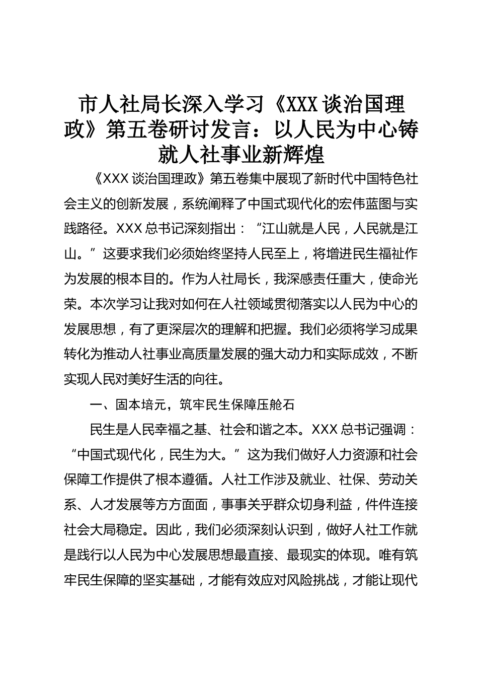 市人社局長(zhǎng)深入學(xué)習(xí)《XXX談治國(guó)理政》第五卷研討發(fā)言:以人民為中心鑄就人社事業(yè)新輝煌《XXX談治國(guó)理政》第五卷集中展現(xiàn)了新時(shí)代中國(guó)特色社會(huì)主義的創(chuàng)新發(fā)展,系統(tǒng)闡釋了中國(guó)式現(xiàn)代化的宏偉藍(lán)圖與實(shí)踐路徑。XXX總書(shū)記深刻指出:“江山就是人民,人民就是江山?!边@要求我們必須始終堅(jiān)持人民至上,將增進(jìn)民生福祉作為發(fā)展的根本目的。作為人社局長(zhǎng),我深感責(zé)任重大,使命光榮。本次學(xué)習(xí)讓我對(duì)如何在人社領(lǐng)域貫徹落實(shí)以人民為中心的發(fā)展思想,有了更深層次的理解和把握。我們必須將學(xué)習(xí)成果轉(zhuǎn)化為推動(dòng)人社事業(yè)高質(zhì)量發(fā)展的強(qiáng)大動(dòng)力和實(shí)際成效,不斷實(shí)現(xiàn)人民對(duì)美好生活的向...