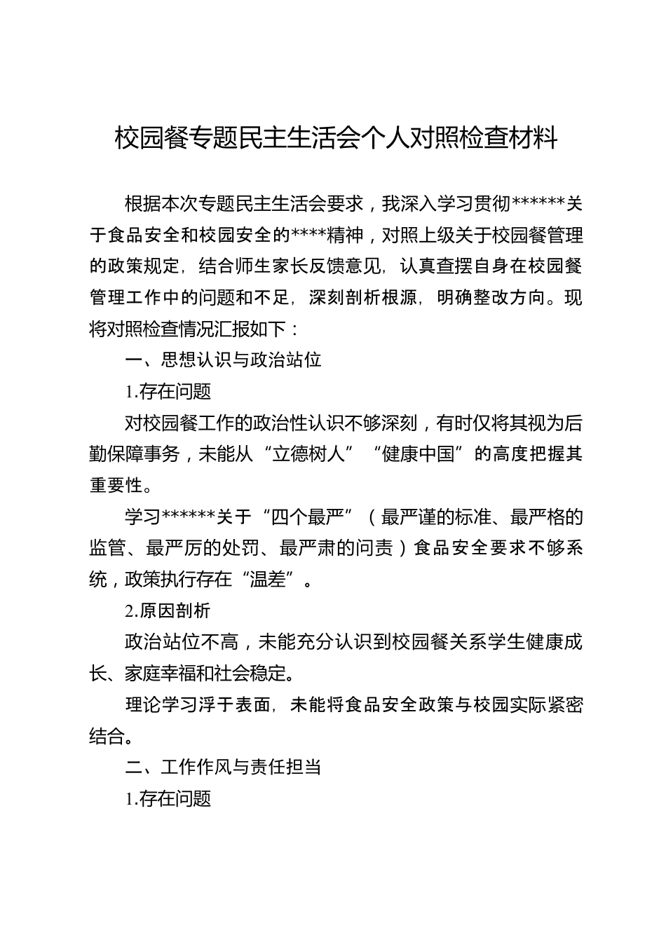 校園餐專題民主生活會(huì)個(gè)人對(duì)照檢查材料根據(jù)本次專題民主生活會(huì)要求,我深入學(xué)習(xí)貫徹******關(guān)于食品安全和校園安全的****精神,對(duì)照上級(jí)關(guān)于校園餐管理的政策定,合生家反意,真自身在校園餐規(guī)結(jié)師長(zhǎng)饋見(jiàn)認(rèn)查擺管理工作中的問(wèn)題和不足,深刻剖析根源,明確整改方向?,F(xiàn)將對(duì)照檢查情況匯報(bào)如下:一、思想認(rèn)識(shí)與政治站位1.存在問(wèn)題對(duì)校園餐工作的政治性認(rèn)識(shí)不夠深刻,有時(shí)僅將其視為后勤保障事務(wù),未能從“立德樹人”“健康中國(guó)”的高度把握其重要性。學(xué)習(xí)******關(guān)于“四個(gè)最嚴(yán)”(最嚴(yán)謹(jǐn)?shù)臉?biāo)準(zhǔn)、最嚴(yán)格的監(jiān)管、最嚴(yán)厲的處罰、最嚴(yán)肅的問(wèn)責(zé))食品安全要求不系夠統(tǒng),政策執(zhí)行...