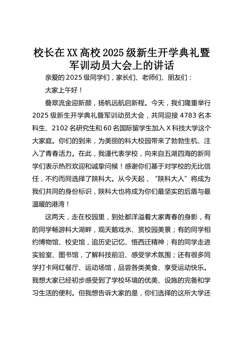 校長(zhǎng)在XX高校2025級(jí)新生開學(xué)典禮暨軍訓(xùn)動(dòng)員大會(huì)上的講話