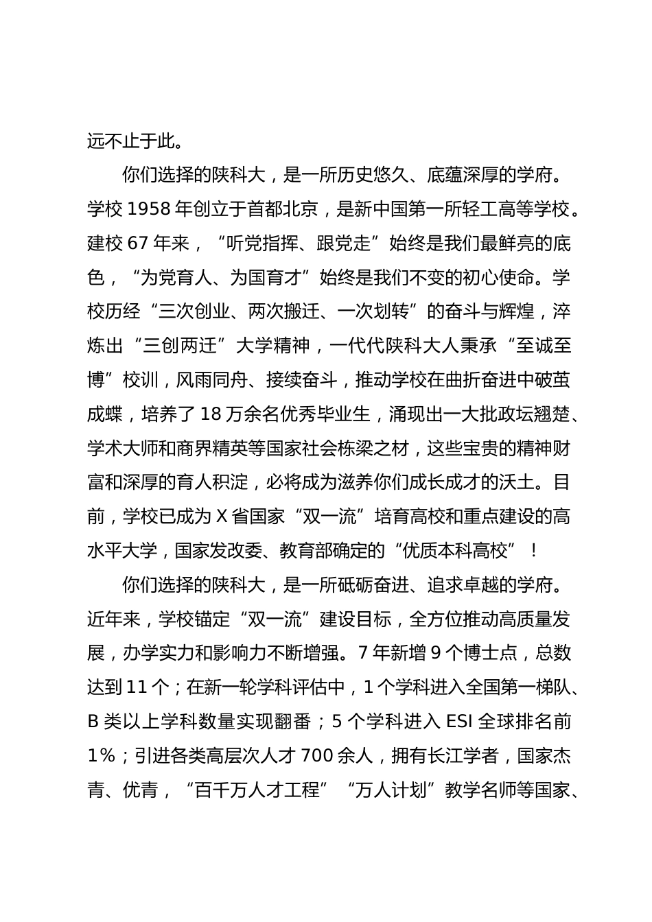 校長(zhǎng)在XX高校2025級(jí)新生開學(xué)典禮暨軍訓(xùn)動(dòng)員大會(huì)上的講話親愛的2025級(jí)同學(xué)們,家長(zhǎng)們、老師們、朋友們:大家上午好!疊翠流金迎新顏,揚(yáng)帆遠(yuǎn)航啟新程。今天,我們隆重舉行2025級(jí)新生開學(xué)典禮暨軍訓(xùn)動(dòng)員大會(huì),共同迎接4783名本科生、2102名研究生和60名國(guó)際留學(xué)生加入X科技大學(xué)這個(gè)大家庭。你們的到來(lái),為美麗的科大校園帶來(lái)了勃勃生機(jī)、注入了青春活力。在此,我謹(jǐn)代表學(xué)校,向來(lái)自五湖四海的新同學(xué)們表示熱烈歡迎和誠(chéng)摯問候!感謝你們基于對(duì)學(xué)校的無(wú)比信任,不約而同選擇了陜科大。從今天起,“陜科大人”將成為我們共同的身份標(biāo)識(shí),陜科大也將成為你們最堅(jiān)實(shí)的后盾與最...