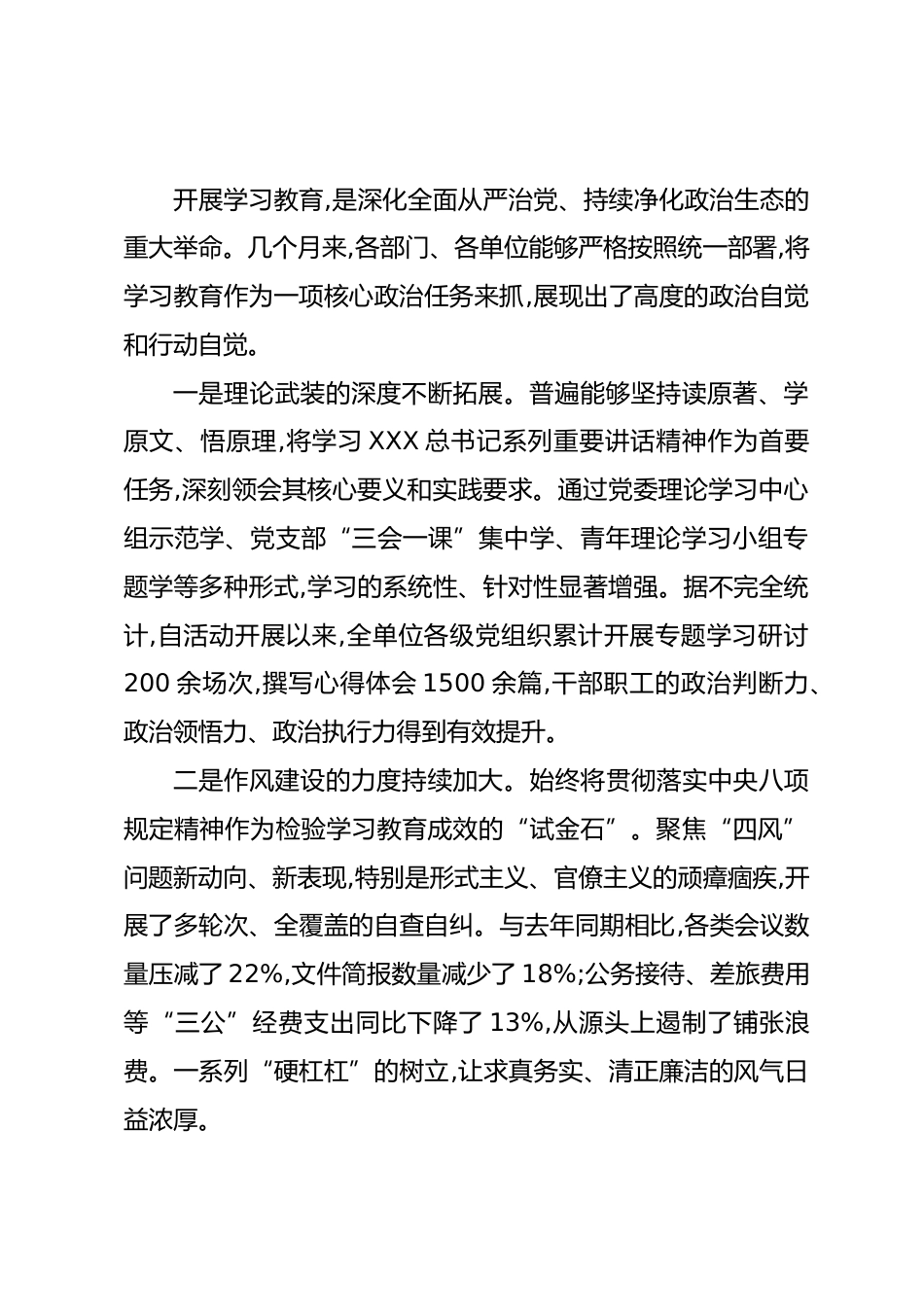 在XX集團(tuán)公司學(xué)習(xí)教育評(píng)估座談會(huì)上的講話同志們:今天,我們?cè)诖苏匍_(kāi)學(xué)習(xí)教育評(píng)估座談會(huì),主要任務(wù)是深入學(xué)習(xí)領(lǐng)會(huì)XXX總書(shū)記關(guān)于作風(fēng)建設(shè)的重要論述精神,認(rèn)真落實(shí)XX集團(tuán)公司的統(tǒng)一部署,系統(tǒng)總結(jié)前一階段學(xué)習(xí)教育的成效與不足,研究分析當(dāng)前面臨的新形勢(shì)新任務(wù),安排部署下一階段的重點(diǎn)工作,旨在以更堅(jiān)定的決心、更有力的舉措、更務(wù)實(shí)的作風(fēng),推動(dòng)學(xué)習(xí)教育走深走實(shí),確保取得經(jīng)得起檢驗(yàn)的成果。剛才,會(huì)議傳達(dá)學(xué)習(xí)了XXX總書(shū)記在二十屆中央政治局第二十一次集體學(xué)習(xí)時(shí)的重要講話精神及上級(jí)有關(guān)文件精神,通報(bào)了本單位學(xué)習(xí)教育工作的總體進(jìn)展情況,XX部、XX分廠等6個(gè)部門(mén)的負(fù)責(zé)同志結(jié)合...