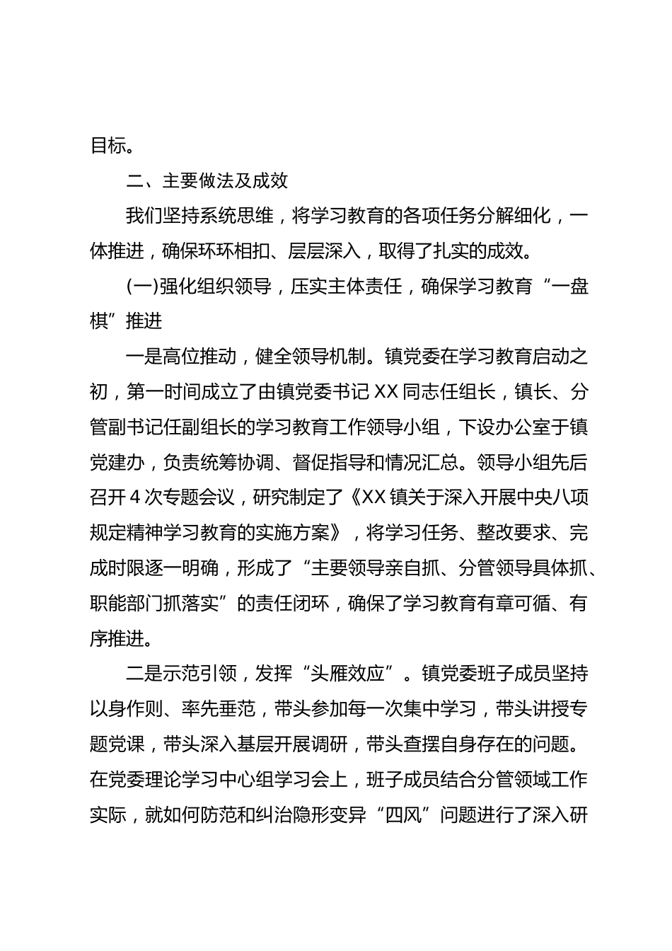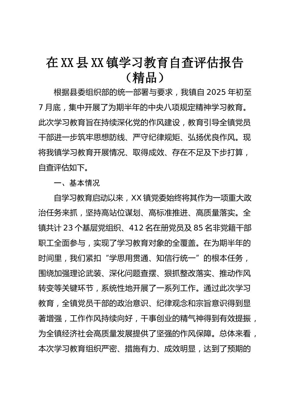 在XX縣XX鎮(zhèn)學(xué)習(xí)教育自查評(píng)估報(bào)告(精品)根據(jù)縣委組織部的統(tǒng)一部署與要求,我鎮(zhèn)自2025年初至7月底,集中開展了為期半年的中央八項(xiàng)規(guī)定精神學(xué)習(xí)教育。此次學(xué)習(xí)教育旨在持續(xù)深化黨的作風(fēng)建設(shè),教育引導(dǎo)全鎮(zhèn)黨員干部進(jìn)一步筑牢思想防線、嚴(yán)守紀(jì)律規(guī)矩、弘揚(yáng)優(yōu)良作風(fēng)?,F(xiàn)將我鎮(zhèn)學(xué)習(xí)教育開展情況、取得成效、存在不足及下步打算,自查評(píng)估如下。一、基本情況自學(xué)習(xí)教育啟動(dòng)以來(lái),XX鎮(zhèn)黨委始終將其作為一項(xiàng)重大政治任務(wù)來(lái)抓,堅(jiān)持高站位謀劃、高標(biāo)準(zhǔn)推進(jìn)、高質(zhì)量落實(shí)。全鎮(zhèn)共計(jì)23個(gè)基層黨組織、412名在冊(cè)黨員及85名非黨籍干部職工全面參與,實(shí)現(xiàn)了學(xué)習(xí)教育對(duì)象的全覆蓋。在為期...