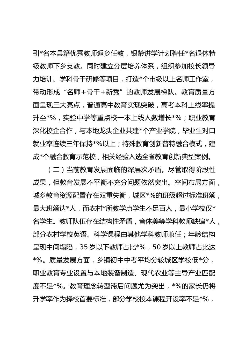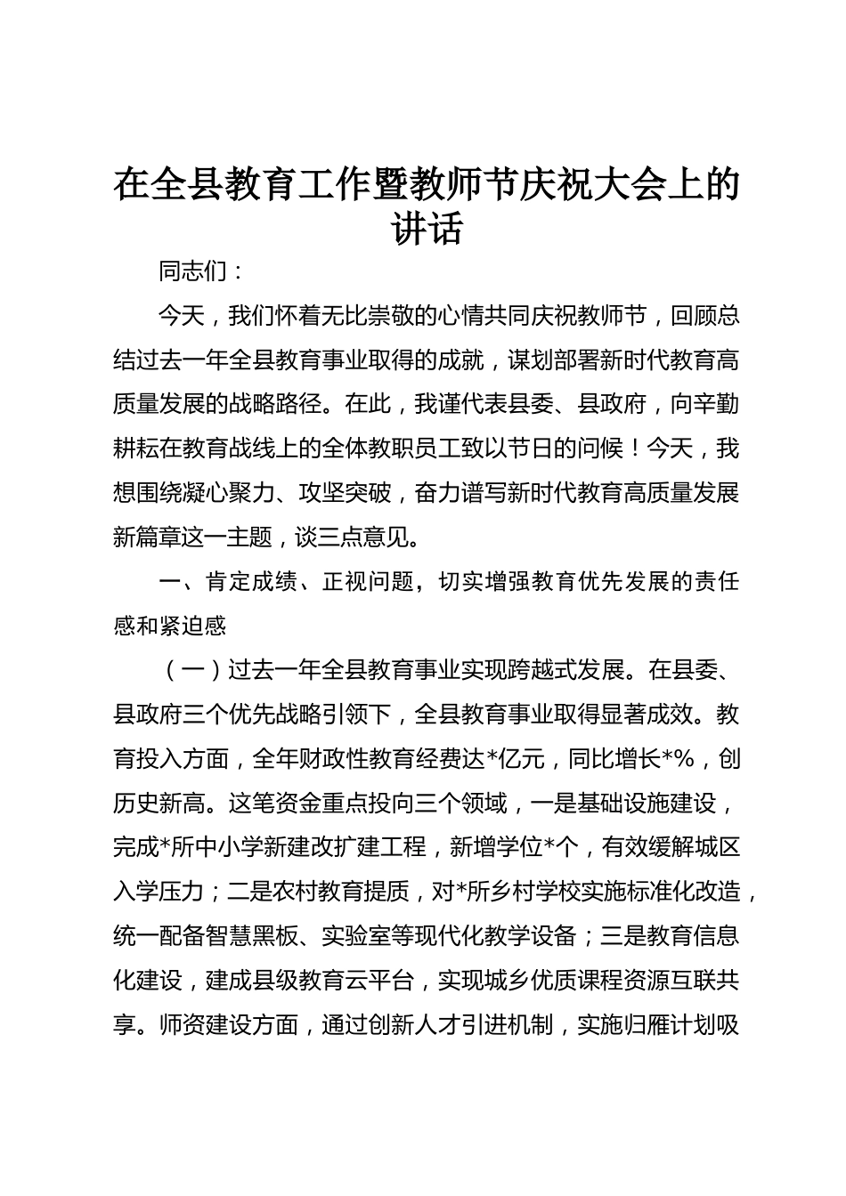 在全縣教育工作暨教師節(jié)慶祝大會上的講話同志們:今天,我們懷著無比崇敬的心情共同慶祝教師節(jié),回顧總結過去一年全縣教育事業(yè)取得的成就,謀劃部署新時代教育高質量發(fā)展的戰(zhàn)略路徑。在此,我謹代表縣委、縣政府,向辛勤耕耘在教育戰(zhàn)線上的全體教職員工致以節(jié)日的問候!今天,我想圍繞凝心聚力、攻堅突破,奮力譜寫新時代教育高質量發(fā)展新篇章這一主題,談三點意見。一、肯定成績、正視問題,切實增強教育優(yōu)先發(fā)展的責任感和緊迫感(一)過去一年全縣教育事業(yè)實現(xiàn)跨越式發(fā)展。在縣委、縣政府三個優(yōu)先戰(zhàn)略引領下,全縣教育事業(yè)取得顯著成效。教育投入方面,全年財政性教育...