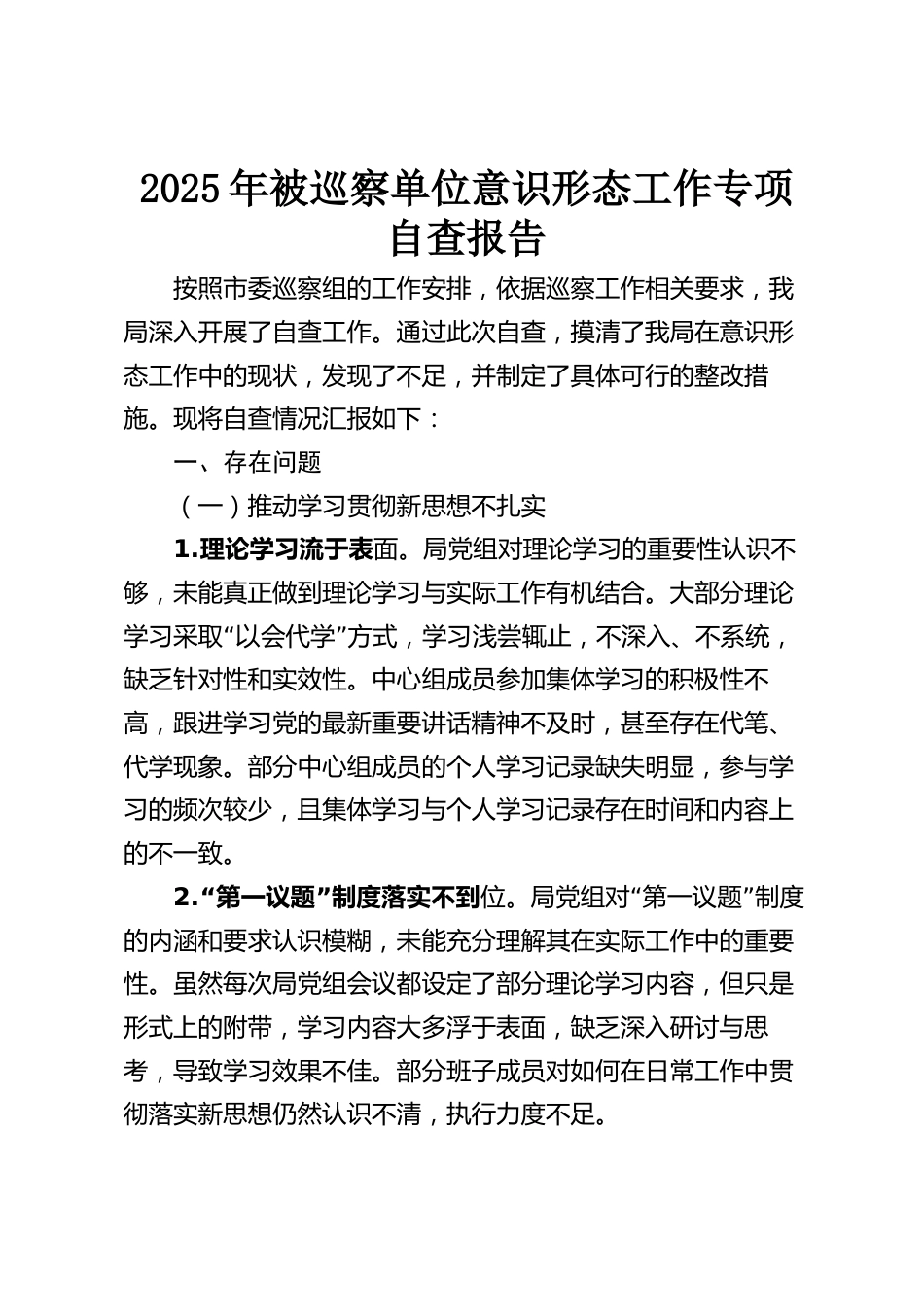 2025年被巡察單位意識(shí)形態(tài)工作專項(xiàng)自查報(bào)告按照市委巡察組的工作安排,依據(jù)巡察工作相關(guān)要求,我局深入開展了自查工作。通過此次自查,摸清了我局在意識(shí)形態(tài)工作中的現(xiàn)狀,發(fā)現(xiàn)了不足,并制定了具體可行的整改措施?,F(xiàn)將自查情況匯報(bào)如下:一、存在問題(一)推動(dòng)學(xué)習(xí)貫徹新思想不扎實(shí)1.理論學(xué)習(xí)流于表面。局黨組對(duì)理論學(xué)習(xí)的重要性認(rèn)識(shí)不夠,未能真正做到理論學(xué)習(xí)與實(shí)際工作有機(jī)結(jié)合。大部分理論“”學(xué)習(xí)采取以會(huì)代學(xué)方式,學(xué)習(xí)淺嘗輒止,不深入、不系統(tǒng),缺乏針對(duì)性和實(shí)效性。中心組成員參加集體學(xué)習(xí)的積極性不高,跟進(jìn)學(xué)習(xí)黨的最新重要講話精神不及時(shí),甚至存在代筆、...