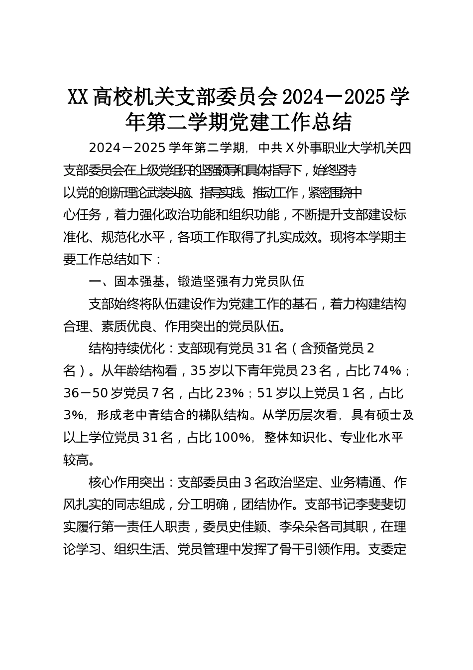 XX高校機關支部委員會2024-2025學年第二學期黨建工作總結2024-2025學年第二學期,中共X外事職業(yè)大學機關四支部委員會在上級黨組織的堅強領導和具體指導下,始終堅持以黨的創(chuàng)新理論武裝頭腦、指導實踐、推動工作,緊密圍繞中心任務,著力強化政治功能和組織功能,不斷提升支部建設標準化、規(guī)范化水平,各項工作取得了扎實成效?,F(xiàn)將本學期主要工作總結如下:一、固本強基,鍛造堅強有力黨員隊伍支部始終將隊伍建設作為黨建工作的基石,著力構建結構合理、素質優(yōu)良、作用突出的黨員隊伍。結構持續(xù)優(yōu)化:支部現(xiàn)有黨員31名(含預備黨員2名)。從年齡結構看,35歲以下青年黨...