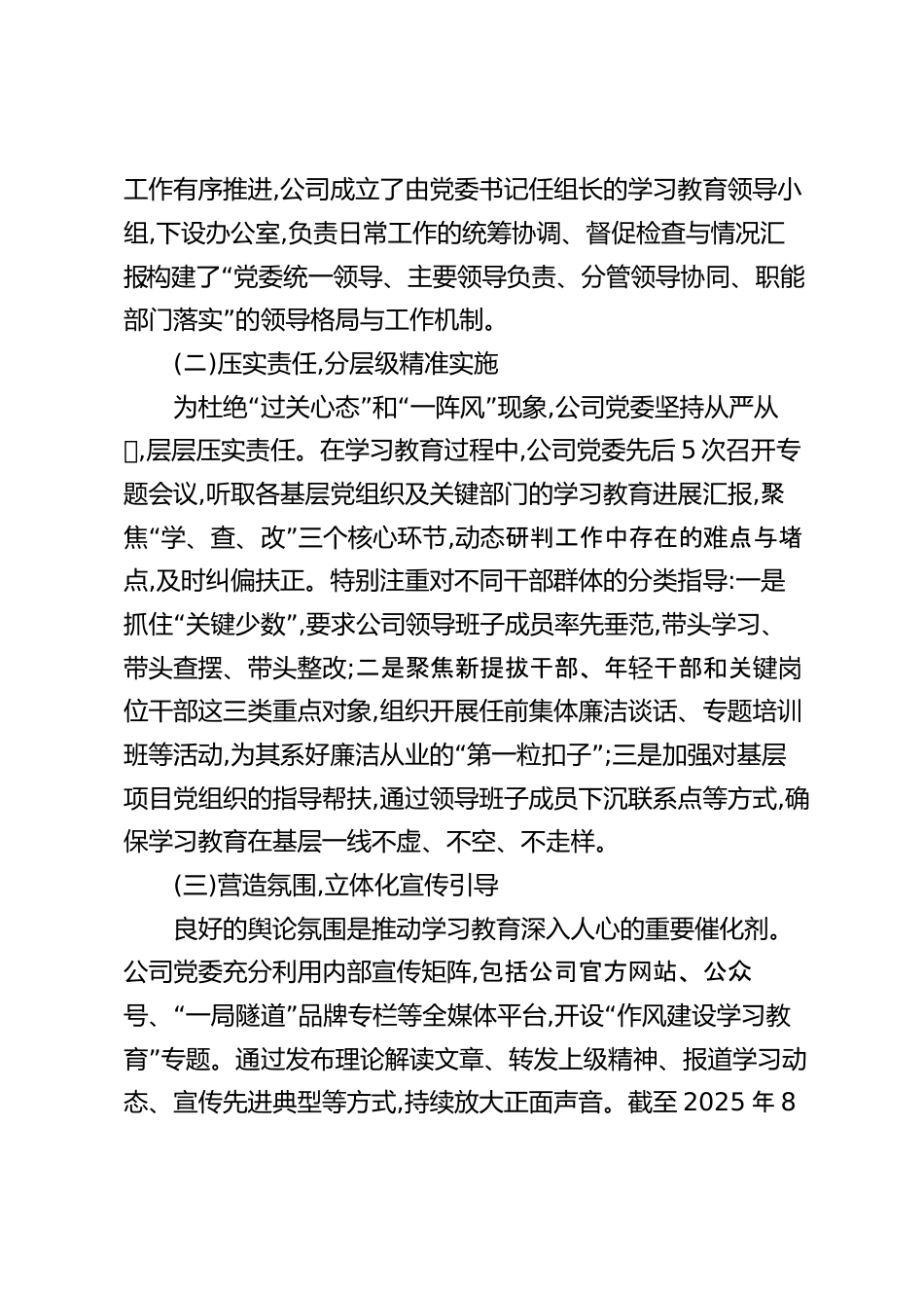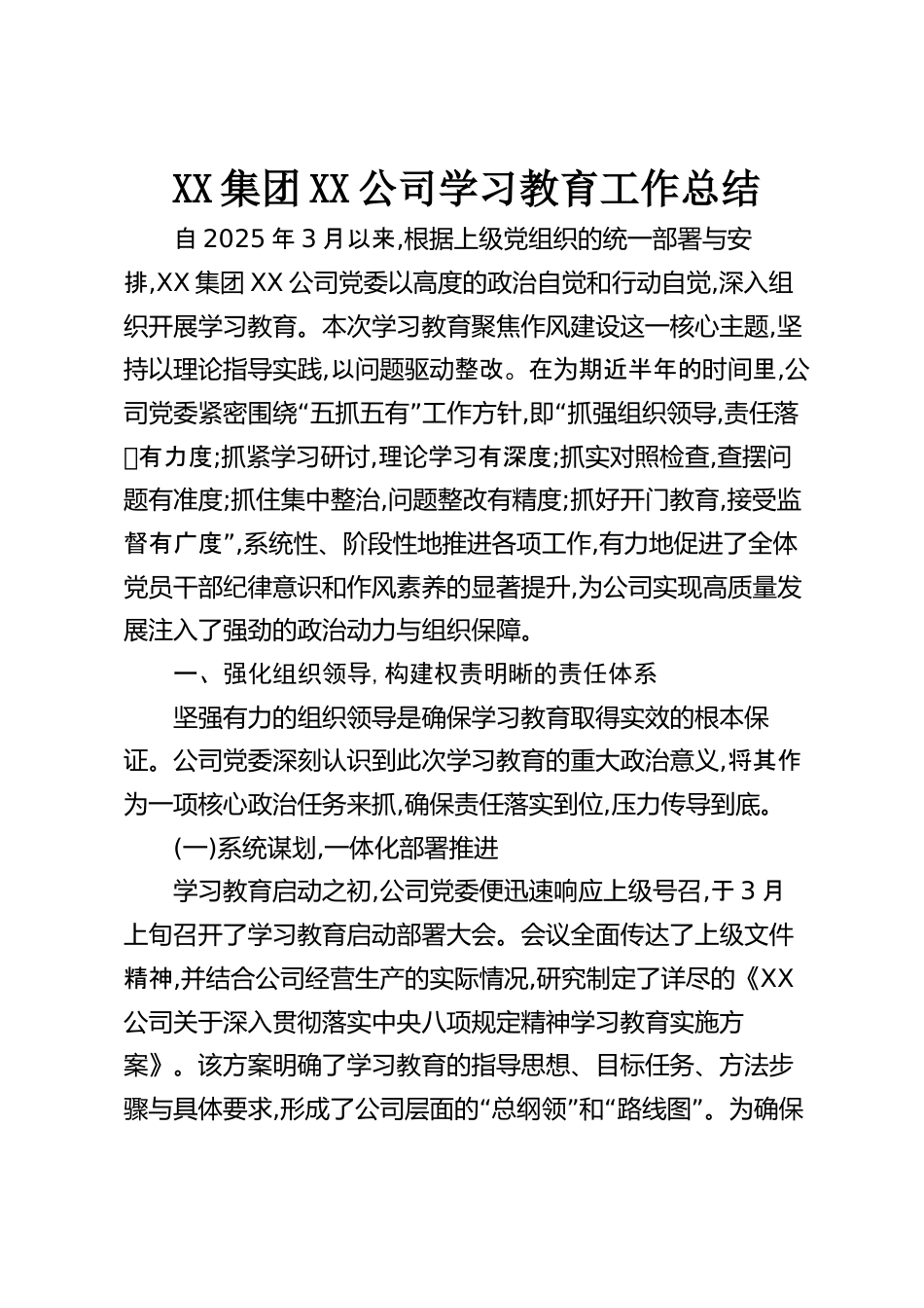 XX集團(tuán)XX公司學(xué)習(xí)教育工作總結(jié)自2025年3月以來,根據(jù)上級(jí)黨組織的統(tǒng)一部署與安排,XX集團(tuán)XX公司黨委以高度的政治自覺和行動(dòng)自覺,深入組織開展學(xué)習(xí)教育。本次學(xué)習(xí)教育聚焦作風(fēng)建設(shè)這一核心主題,堅(jiān)持以理論指導(dǎo)實(shí)踐,以整改。在期近半年的里問題驅(qū)動(dòng)為時(shí)間,公“”司黨委緊密圍繞五抓五有工作方針,“即抓強(qiáng)組織領(lǐng)導(dǎo),責(zé)任落實(shí)有力度;抓緊學(xué)習(xí)研討,理學(xué)有深度論習(xí);抓實(shí)對(duì)照檢查,查擺問題有準(zhǔn)度;抓住集中整治,問題整改有精度;抓好開門教育,接受監(jiān)”督有廣度,系統(tǒng)性、階段性地推進(jìn)各項(xiàng)工作,有力地促進(jìn)了全體黨員干部紀(jì)律意識(shí)和作風(fēng)素養(yǎng)的顯著提升,為公司實(shí)現(xiàn)高質(zhì)量發(fā)展注入了強(qiáng)勁的...