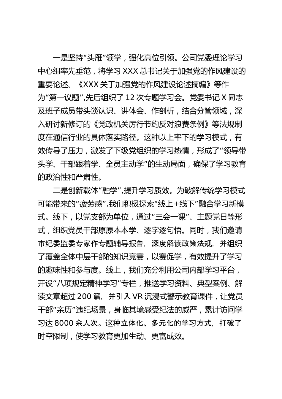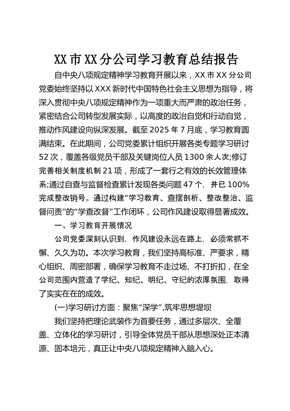XX市XX分公司學(xué)習(xí)教育總結(jié)報告自中央八項規(guī)定精神學(xué)習(xí)教育開展以來,XX市XX分公司黨委始終堅持以XXX新時代中國特色社會主義思想為指導(dǎo),將深入貫徹中央八項規(guī)定精神作為一項重大而嚴肅的政治任務(wù),緊密結(jié)合公司轉(zhuǎn)型發(fā)展實際,以高度的政治自覺和行動自覺,推動作風(fēng)建設(shè)向縱深發(fā)展。截至2025年7月底,學(xué)習(xí)教育圓滿結(jié)束。在此期間,公司黨委累計組織開展各類專題學(xué)習(xí)研討52次,覆蓋各級黨員干部及關(guān)鍵崗位人員1300余人次;修訂完善相關(guān)制度機制21項,形成了一套行之有效的長效管理體系;通過自查與監(jiān)督檢查累計發(fā)現(xiàn)各類問題47個,并已100%“完成整改號。通構(gòu)建學(xué)教育、剖析、...