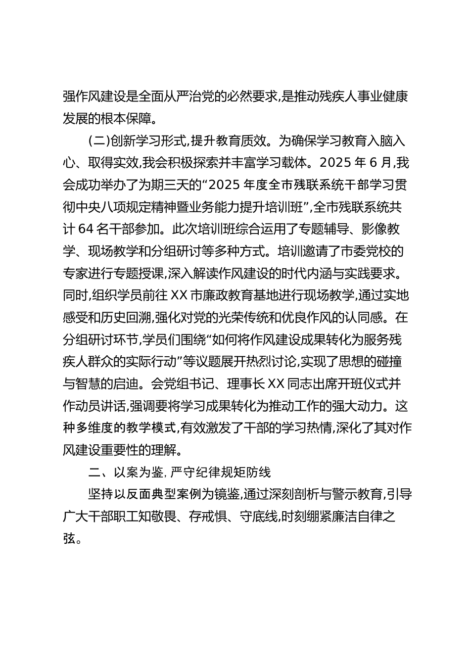 XX市殘疾人聯(lián)合會關(guān)于開展學(xué)習(xí)教育的總結(jié)報告為深入貫徹落實中央、省委及市委關(guān)于加強作風(fēng)建設(shè)的系列重要部署,系統(tǒng)學(xué)習(xí)并踐行XXX總書記關(guān)于黨的作風(fēng)建設(shè)的重要論述,我會嚴(yán)格按照上級要求,結(jié)合殘疾人事業(yè)發(fā)展實際,于近期集中開展了作風(fēng)建設(shè)學(xué)習(xí)教育活動。本次活動旨在教育引導(dǎo)全體干部職工堅定理想信念,筑牢紀(jì)律防線,以優(yōu)良作風(fēng)凝聚奮進力量,推動新時代我市殘疾人事業(yè)實現(xiàn)高質(zhì)量發(fā)展。現(xiàn)將有關(guān)情況總結(jié)報告如下。一、以學(xué)為基,筑牢理想信念根基持將理學(xué)作首要任堅論習(xí)為務(wù),通過系統(tǒng)化、常態(tài)化的學(xué)習(xí)安排,引導(dǎo)全體干部職工在學(xué)深悟透中夯實思想政治基礎(chǔ),不斷提升政治判斷力...