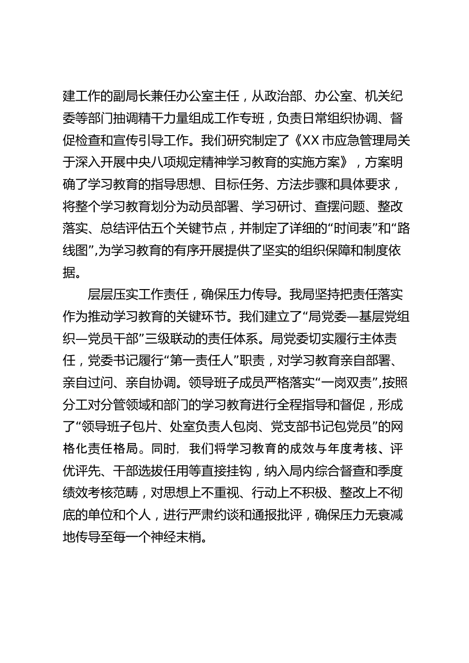 XX市應(yīng)急管理局學(xué)習(xí)教育總結(jié)評估報告根據(jù)中央、省委和市委的統(tǒng)一部署,按照市委組織部的具體要求,我局自2025年3月至7月,集中開展了期四個月為的深入貫徹中央八項(xiàng)規(guī)定精神學(xué)習(xí)教育,并同步部署了常態(tài)化長效化推進(jìn)工作。學(xué)習(xí)教育覆蓋局機(jī)關(guān)、直屬事業(yè)單位和各大隊全體黨員干部及公職人員,確保了全員參與、全面覆蓋。期間,共組織黨委理論學(xué)習(xí)中心組專題學(xué)習(xí)16次,舉辦各類專題研討會、警示教育會21場,領(lǐng)導(dǎo)干部帶頭講授專題黨課30余次,系統(tǒng)排查梳理出4大類86項(xiàng)問題,并制定了專項(xiàng)整治方案。通過系統(tǒng)謀劃、精心組織和扎實(shí)推進(jìn),學(xué)習(xí)教育取得了顯著的階段性成效,全局干...