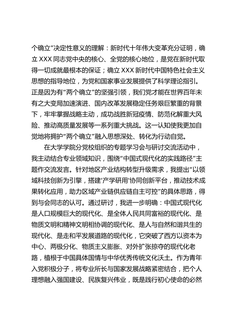 大學(xué)入黨積極分子三季度思想?yún)R報(bào)敬愛的黨組織:自被確定為入黨積極分子以來,在黨組織的系統(tǒng)性培養(yǎng)教育與同志們的精準(zhǔn)幫帶指導(dǎo)下,我對(duì)黨的性質(zhì)宗旨、初心使命的認(rèn)知實(shí)現(xiàn)深度躍升,政治判斷力、政治領(lǐng)悟力、政治執(zhí)行力得到持續(xù)錘煉。我始終以黨章規(guī)定的黨員標(biāo)準(zhǔn)校準(zhǔn)思想航向、規(guī)范言行舉止,在思想淬煉、理論武裝、實(shí)踐篤行中不斷向黨組織靠攏。現(xiàn)將近期思想動(dòng)態(tài)、理論學(xué)習(xí)成效及實(shí)踐履職情況向黨組織作專題匯報(bào)。一、深化理論武裝,筑牢信仰之基,深刻領(lǐng)悟“兩個(gè)確立”的決定性意義思想是行動(dòng)的先導(dǎo),理論是實(shí)踐的指南。作為新時(shí)代青年入黨積極分子,我深刻認(rèn)識(shí)到,筑牢...
