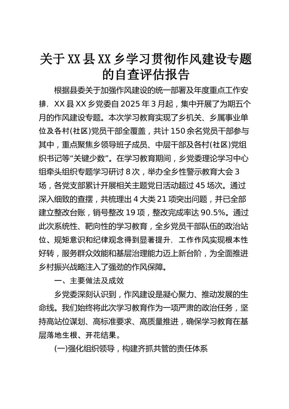 關于XX縣XX鄉(xiāng)學習貫徹作風建設專題的自查評估報告