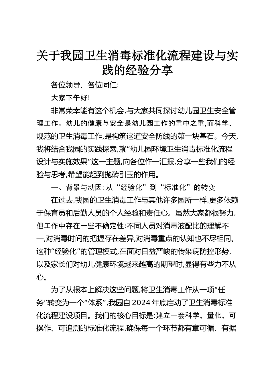 關(guān)于我園衛(wèi)生消毒標(biāo)準(zhǔn)化流程建設(shè)與實(shí)踐的經(jīng)驗(yàn)分享各位領(lǐng)導(dǎo)、各位同仁:大家下午好!非常榮幸能有這個(gè)機(jī)會(huì),與大家共同探討幼兒園衛(wèi)生安全管理工作。幼兒的健康與安全是幼兒園工作的重中之重,而科學(xué)、規(guī)范的衛(wèi)生消毒工作,是構(gòu)筑這道安全防線的第一塊基石。今天,我將結(jié)合我園的實(shí)踐探索,“就幼兒園環(huán)境衛(wèi)生消毒標(biāo)準(zhǔn)化流程”設(shè)計(jì)與實(shí)施效果這一主題,向各位作一匯報(bào),分享一些我們的經(jīng)驗(yàn)與思考,希望能起到拋磚引玉的作用。一、背景與動(dòng)因:從“經(jīng)驗(yàn)化”到“標(biāo)準(zhǔn)化”的轉(zhuǎn)變?cè)谶^(guò)去,我園的衛(wèi)生消毒工作與其他許多園所一樣,更多依賴(lài)于保育員和后勤人員的個(gè)人經(jīng)驗(yàn)和責(zé)任心。雖然大家都...