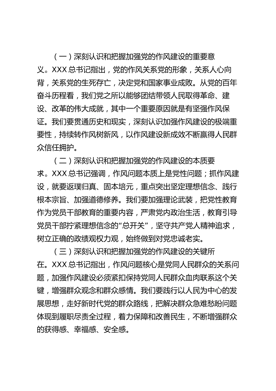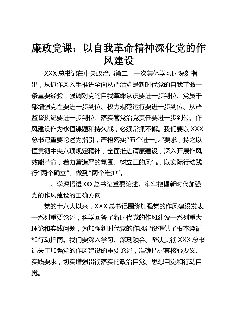 廉政黨課:以自我革命精神深化黨的作風(fēng)建設(shè)XXX總書記在中央政治局第二十一次集體學(xué)習(xí)時深刻指出,從抓作風(fēng)入手推進全面從嚴治黨是新時代黨的自我革命一條重要經(jīng)驗,強調(diào)對黨的自我革命認識要進一步到位、黨員干部增強黨性要進一步到位、權(quán)力規(guī)范運行要進一步到位、從嚴監(jiān)督執(zhí)紀要進一步到位、落實管黨治黨責(zé)任要進一步到位。作風(fēng)建設(shè)作為永恒課題和持久戰(zhàn),必須常抓不懈。我們要以XXX“”總書記重要論述為指引,嚴格落實五個進一步要求,持之以恒貫徹中央八項規(guī)定精神,全面推進清廉建設(shè),深入開展作風(fēng)效能革命,著力營造嚴的氛圍、樹立正的風(fēng)氣,以實際行動踐“”“”行...