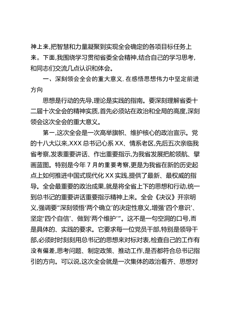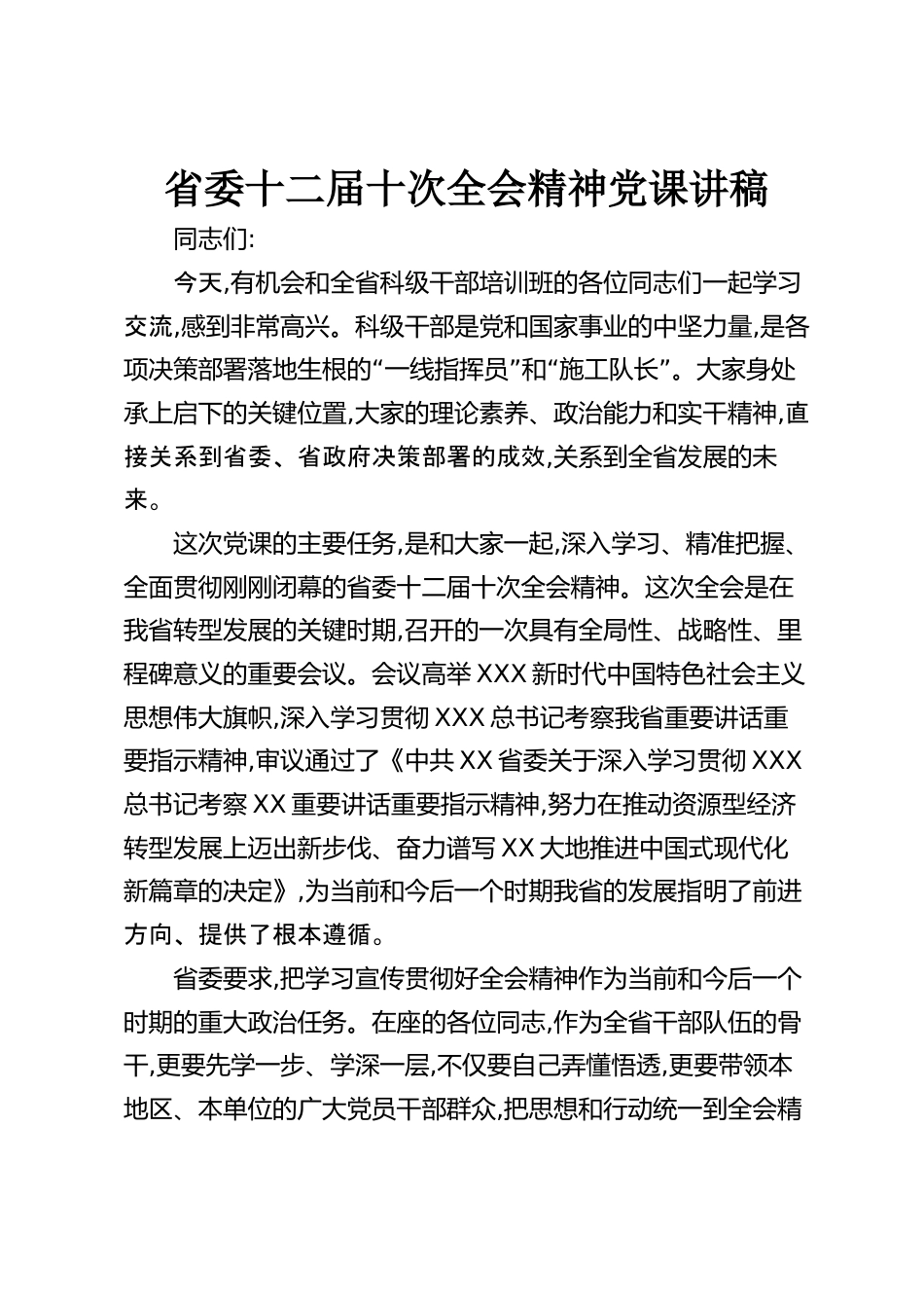 省委十二屆十次全會(huì)精神黨課講稿同志們:今天,有機(jī)會(huì)和全省科級(jí)干部培訓(xùn)班的各位同志們一起學(xué)習(xí)交流,感到非常高興??萍?jí)干部是黨和國(guó)家事業(yè)的中堅(jiān)力量,是各“”“”項(xiàng)決策部署落地生根的一線指揮員和施工隊(duì)長(zhǎng)。大家身處承上啟下的關(guān)鍵位置,大家的理論素養(yǎng)、政治能力和實(shí)干精神,直接關(guān)系到省委、省政府決策部署的成效,關(guān)系到全省發(fā)展的未來(lái)。這次黨課的主要任務(wù),是和大家一起,深入學(xué)習(xí)、精準(zhǔn)把握、全面貫徹剛剛閉幕的省委十二屆十次全會(huì)精神。這次全會(huì)是在我省轉(zhuǎn)型發(fā)展的關(guān)鍵時(shí)期,召開(kāi)的一次具有全局性、戰(zhàn)略性、里程碑意義的重要會(huì)議。會(huì)議高舉XXX新時(shí)代中國(guó)特色社會(huì)主義...