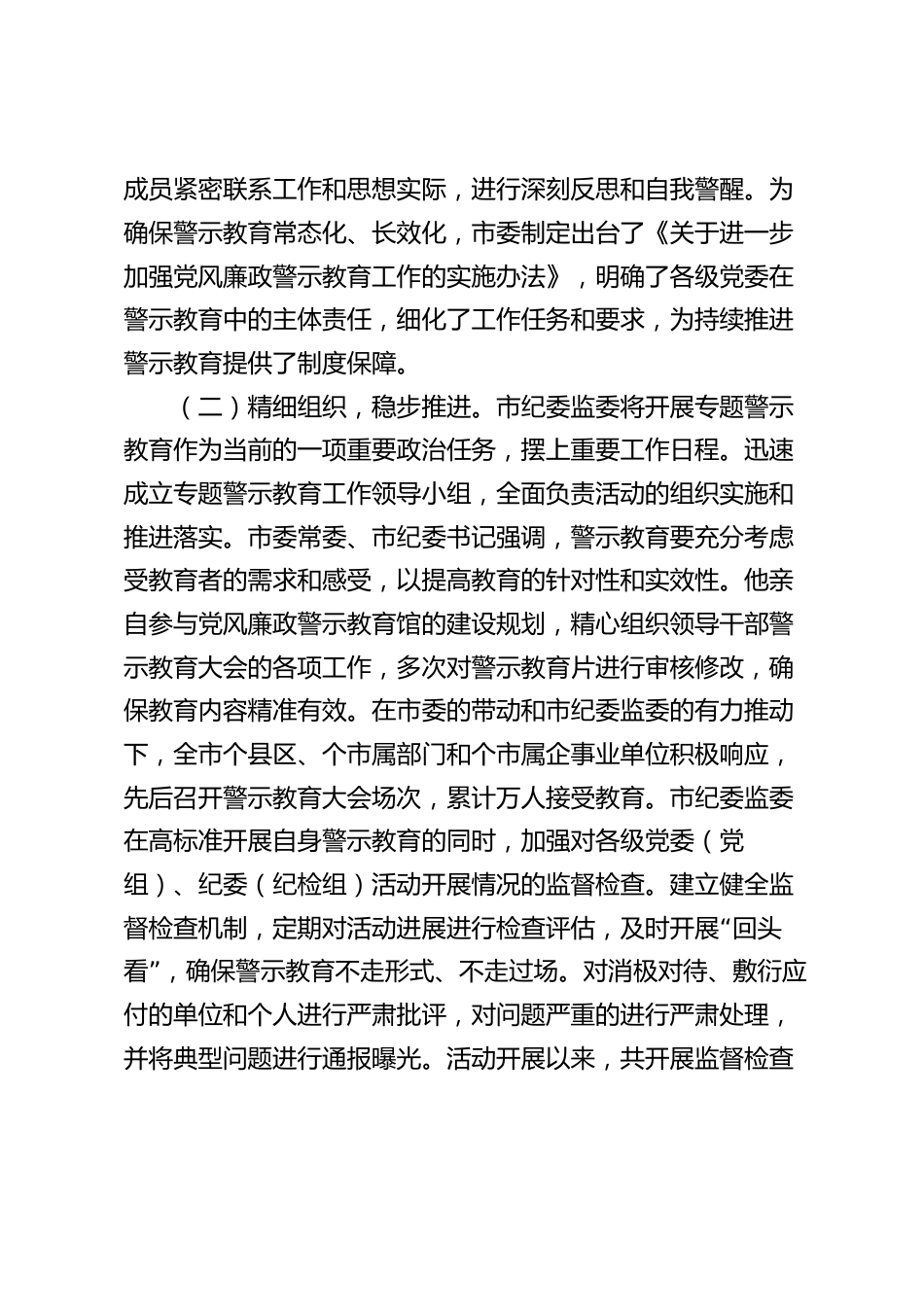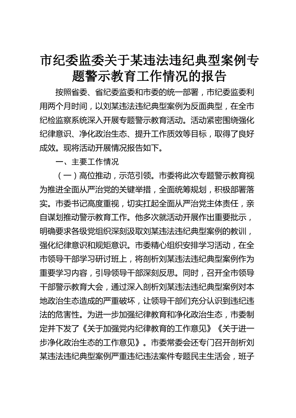 市紀(jì)委監(jiān)委關(guān)于某違法違紀(jì)典型案例專題警示教育工作情況的報(bào)告按照省委、省紀(jì)委監(jiān)委和市委的統(tǒng)一部署,市紀(jì)委監(jiān)委利用兩個(gè)月時(shí)間,以劉某違法違紀(jì)典型案例為反面典型,在全市紀(jì)檢監(jiān)察系統(tǒng)深入開展專題警示教育活動(dòng)?;顒?dòng)緊密圍繞強(qiáng)化紀(jì)律意識(shí)、凈化政治生態(tài)、提升工作質(zhì)效等目標(biāo),取得了良好成效?,F(xiàn)將活動(dòng)開展情況報(bào)告如下。一、主要工作情況(一)高位推動(dòng),示范引領(lǐng)。市委將此次專題警示教育視為推進(jìn)全面從嚴(yán)治黨的關(guān)鍵舉措,全面統(tǒng)籌規(guī)劃,積極部署落實(shí)。市委書記高度重視,切實(shí)扛起全面從嚴(yán)治黨主體責(zé)任,親自謀劃推動(dòng)警示教育工作。他多次就活動(dòng)開展作出重要批示,...