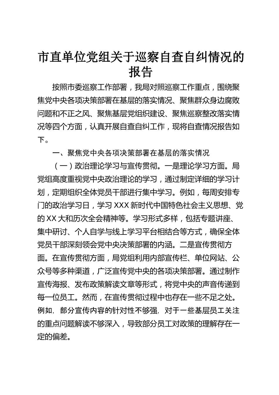 市直單位黨組關(guān)于巡察自查自糾情況的報(bào)告按照市委巡察工作部署,我局對(duì)照巡察工作重點(diǎn),圍繞聚焦黨中央各項(xiàng)決策部署在基層的落實(shí)情況、聚焦群眾身邊腐敗問題和不正之風(fēng)、聚焦基層黨組織建設(shè)、聚焦巡察整改落實(shí)情況等四個(gè)方面,認(rèn)真開展自查自糾工作,現(xiàn)將自查情況報(bào)告如下。一、聚焦黨中央各項(xiàng)決策部署在基層的落實(shí)情況(一)政治理論學(xué)習(xí)與宣傳貫徹。一是理論學(xué)習(xí)方面。局黨組高度重視黨中央政治理論的學(xué)習(xí),通過制定詳細(xì)的學(xué)習(xí)計(jì)劃,定期組織全體黨員干部進(jìn)行集中學(xué)習(xí)。例如,每周安排專門的政治學(xué)習(xí)日,學(xué)習(xí)XXX新時(shí)代中國特色社會(huì)主義思想、黨的XX大和歷次全會(huì)精神等...