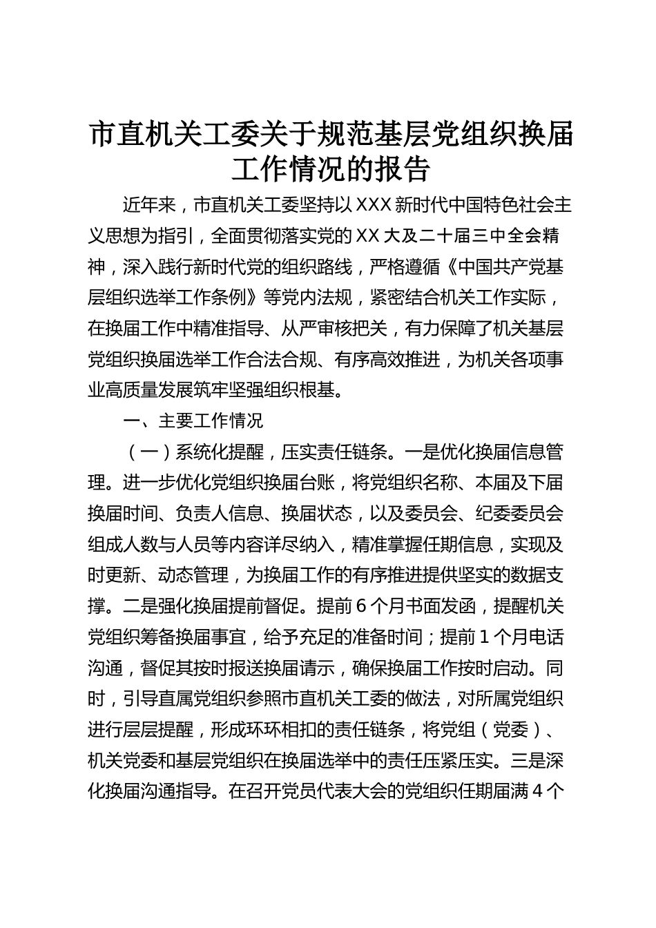 市直機(jī)關(guān)工委關(guān)于規(guī)范基層黨組織換屆工作情況的報告近年來,市直機(jī)關(guān)工委堅持以XXX新時代中國特色社會主義思想為指引,全面貫徹落實黨的XX大及二十屆三中全會精神,深入踐行新時代黨的組織路線,嚴(yán)格遵循《中國共產(chǎn)黨基層組織選舉工作條例》等黨內(nèi)法規(guī),緊密結(jié)合機(jī)關(guān)工作實際,在換屆工作中精準(zhǔn)指導(dǎo)、從嚴(yán)審核把關(guān),有力保障了機(jī)關(guān)基層黨組織換屆選舉工作合法合規(guī)、有序高效推進(jìn),為機(jī)關(guān)各項事業(yè)高質(zhì)量發(fā)展筑牢堅強(qiáng)組織根基。一、主要工作情況(一)系統(tǒng)化提醒,壓實責(zé)任鏈條。一是優(yōu)化換屆信息管理。進(jìn)一步優(yōu)化黨組織換屆臺賬,將黨組織名稱、本屆及下屆換屆時間、負(fù)責(zé)...