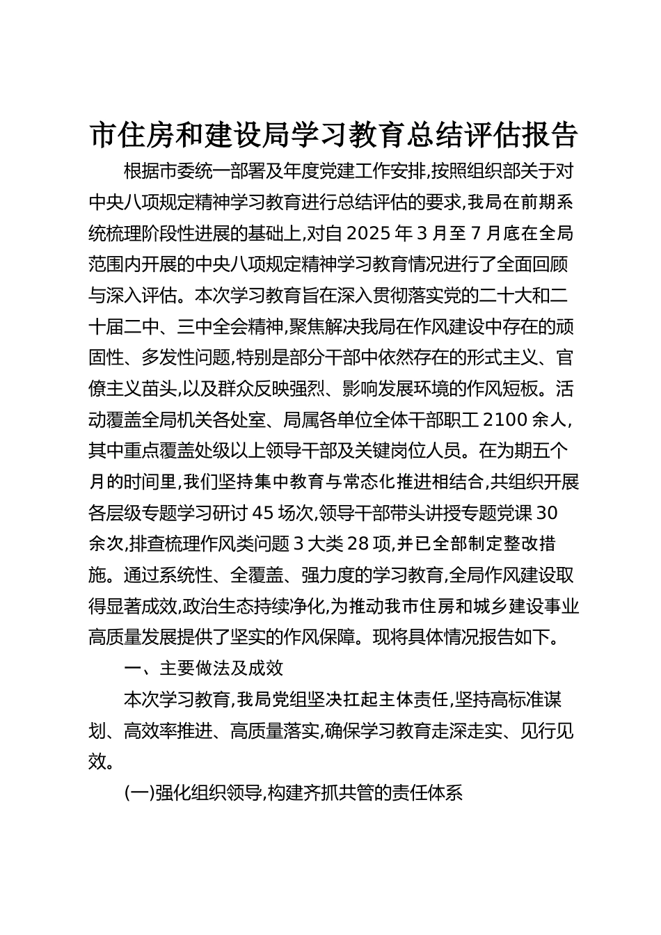 市住房和建設局學習教育總結(jié)評估報告根據(jù)市委統(tǒng)一部署及年度黨建工作安排,按照組織部關于對中央八項規(guī)定精神學習教育進行總結(jié)評估的要求,我局在前期系統(tǒng)梳理階段性進展的基礎上,對自2025年3月至7月底在全局范圍內(nèi)開展的中央八項規(guī)定精神學習教育情況進行了全面回顧與深入評估。本次學習教育旨在深入貫徹落實黨的二十大和二十屆二中、三中全會精神,聚焦解決我局在作風建設中存在的頑固性、多發(fā)性問題,特別是部分干部中依然存在的形式主義、官僚主義苗頭,以及群眾反映強烈、影響發(fā)展環(huán)境的作風短板?;顒痈采w全局機關各處室、局屬各單位全體干部職工2100余人,其中重點覆蓋...