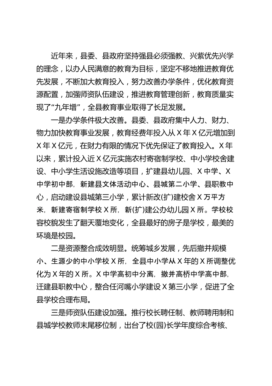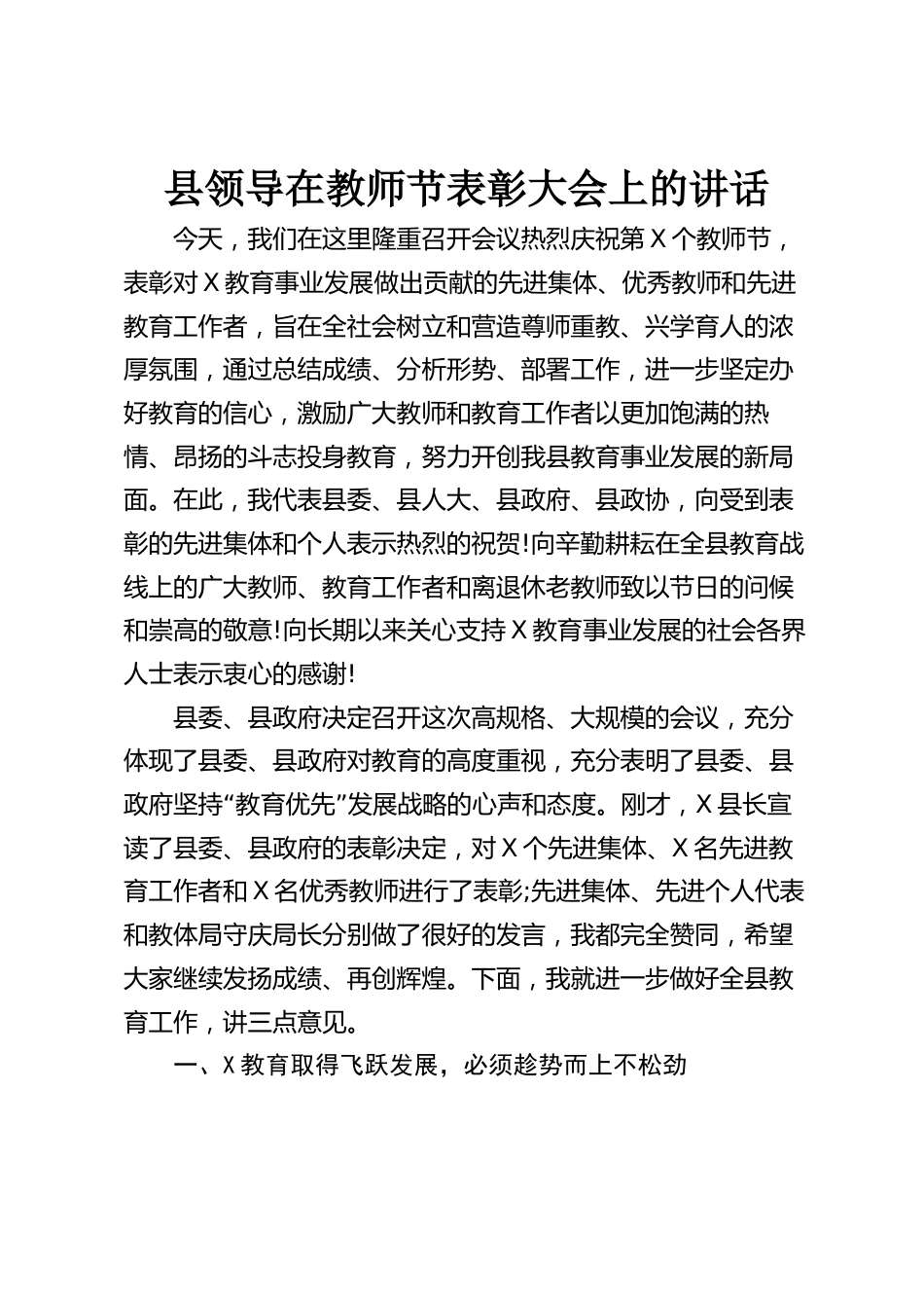 縣領導在教師節(jié)表彰大會上的講話今天,我們在這里隆重召開會議熱烈慶祝第X個教師節(jié),表彰對X教育事業(yè)發(fā)展做出貢獻的先進集體、優(yōu)秀教師和先進教育工作者,旨在全社會樹立和營造尊師重教、興學育人的濃厚氛圍,通過總結(jié)成績、分析形勢、部署工作,進一步堅定辦好教育的信心,激勵廣大教師和教育工作者以更加飽滿的熱情、昂揚的斗志投身教育,努力開創(chuàng)我縣教育事業(yè)發(fā)展的新局面。在此,我代表縣委、縣人大、縣政府、縣政協(xié),向受到表彰的先進集體和個人表示熱烈的祝賀!向辛勤耕耘在全縣教育戰(zhàn)線上的廣大教師、教育工作者和離退休老教師致以節(jié)日的問候和崇高的敬意!向長期以...