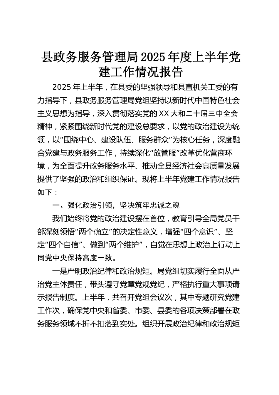 縣政務(wù)服務(wù)管理局2025年度上半年黨建工作情況報告2025年上半年,在縣委的堅強領(lǐng)導(dǎo)和縣直機關(guān)工委的有力指導(dǎo)下,縣政務(wù)服務(wù)管理局黨組堅持以新時代中國特色社會主義思想為指導(dǎo),深入貫徹落實黨的XX大和二十屆三中全會精神,緊緊圍繞新時代黨的建設(shè)總要求,以黨的政治建設(shè)為統(tǒng)“”領(lǐng),以圍繞中心、建設(shè)隊伍、服務(wù)群眾為核心任務(wù),深度融“”合黨建與政務(wù)服務(wù)工作,持續(xù)深化放管服改革優(yōu)化營商環(huán)境,為全面提升政務(wù)服務(wù)水平、推動全縣經(jīng)濟社會高質(zhì)量發(fā)展提供了堅強的政治和組織保證?,F(xiàn)將上半年黨建工作情況報告如下:一、強化政治引領(lǐng),堅決筑牢忠誠之魂我們始終將黨的政治...