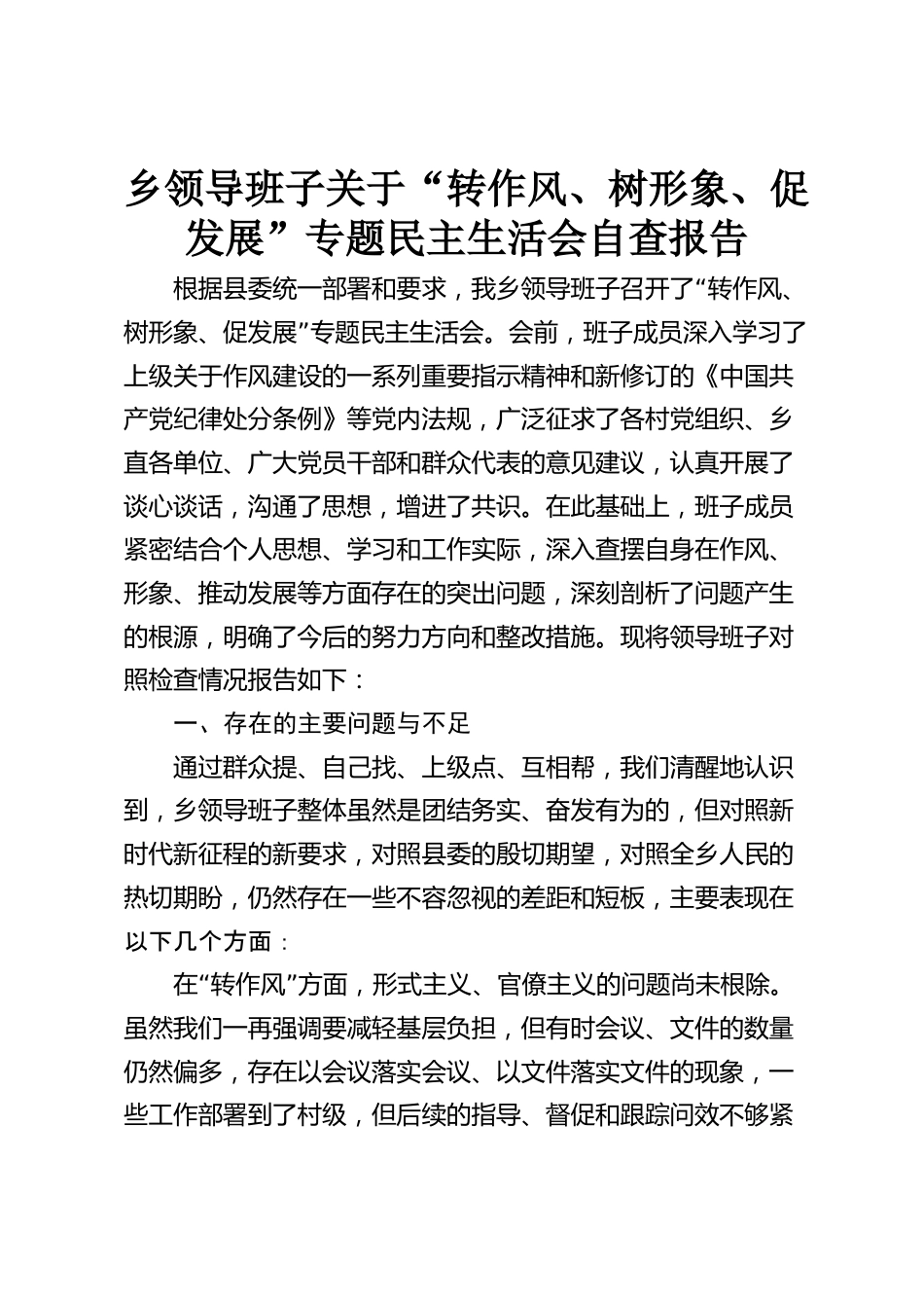 鄉(xiāng)領(lǐng)導(dǎo)班子關(guān)于“轉(zhuǎn)作風(fēng)、樹(shù)形象、促發(fā)展”專(zhuān)題民主生活會(huì)自查報(bào)告
