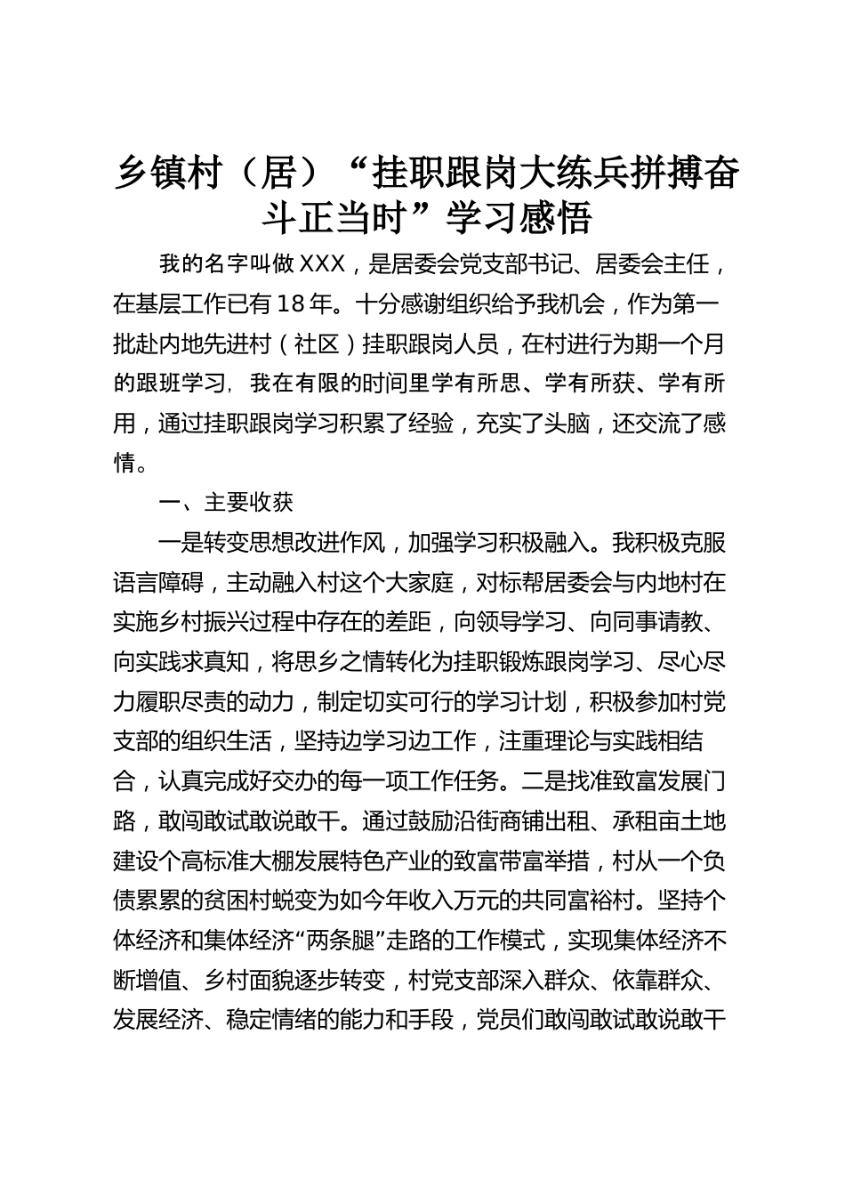 鄉(xiāng)鎮(zhèn)村(居)“掛職跟崗大練兵拼搏奮斗正當(dāng)時(shí)”學(xué)習(xí)感悟我的名字叫做XXX,是居委會(huì)黨支部書記、居委會(huì)主任,在基層工作已有18年。十分感謝組織給予我機(jī)會(huì),作為第一批赴內(nèi)地先進(jìn)村(社區(qū))掛職跟崗人員,在村進(jìn)行為期一個(gè)月的跟班學(xué),我在有限的里學(xué)有所思、學(xué)有所、學(xué)有所習(xí)時(shí)間獲用,通過掛職跟崗學(xué)習(xí)積累了經(jīng)驗(yàn),充實(shí)了頭腦,還交流了感情。一、主要收獲一是轉(zhuǎn)變思想改進(jìn)作風(fēng),加強(qiáng)學(xué)習(xí)積極融入。我積極克服語(yǔ)言障礙,主動(dòng)融入村這個(gè)大家庭,對(duì)標(biāo)幫居委會(huì)與內(nèi)地村在實(shí)施鄉(xiāng)村振興過程中存在的差距,向領(lǐng)導(dǎo)學(xué)習(xí)、向同事請(qǐng)教、向?qū)嵺`求真知,將思鄉(xiāng)之情轉(zhuǎn)化為掛職鍛煉跟...