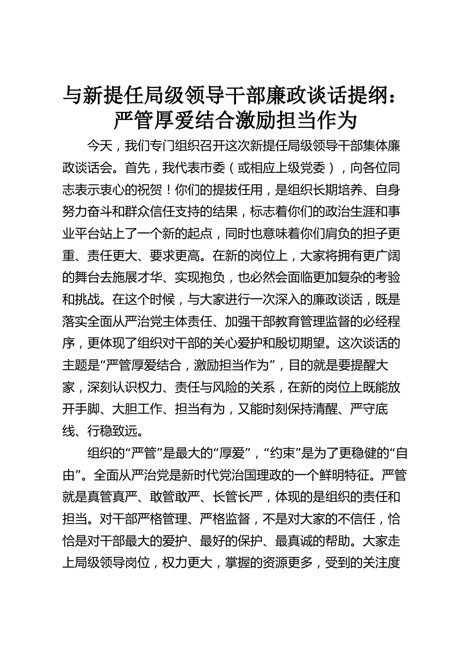 與新提任局級領(lǐng)導(dǎo)干部廉政談話提綱:嚴(yán)管厚愛結(jié)合 激勵擔(dān)當(dāng)作為
