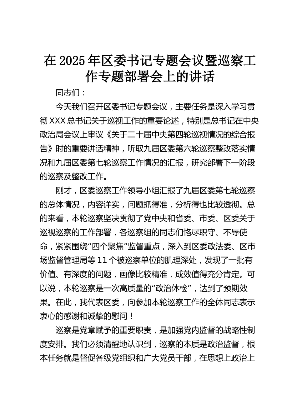 在2025年區(qū)委書記專題會議暨巡察工作專題部署會上的講話