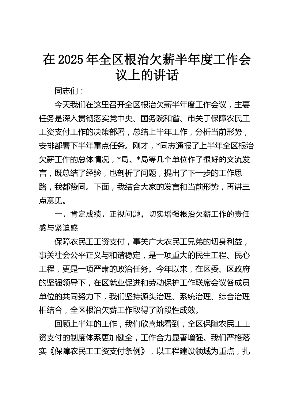 在2025年全區(qū)根治欠薪半年度工作會議上的講話同志們:今天我們在這里召開全區(qū)根治欠薪半年度工作會議,主要任務(wù)是深入貫徹落實(shí)黨中央、國務(wù)院和省、市關(guān)于保障農(nóng)民工工資支付工作的決策部署,總結(jié)上半年工作,分析當(dāng)前形勢,安排部署下半年重點(diǎn)任務(wù)。剛才,*同志通報了上半年全區(qū)根治欠薪工作的總體情況,*局、*局等幾個單位作了很好的交流發(fā)言,既總結(jié)了經(jīng)驗(yàn),也剖析了問題,提出了下一步的工作思路,我都贊同。下面,我結(jié)合大家的發(fā)言和當(dāng)前形勢,再講三點(diǎn)意見。一、肯定成績、正視問題,切實(shí)增強(qiáng)根治欠薪工作的責(zé)任感與緊迫感保障農(nóng)民工工資支付,事關(guān)廣大農(nóng)民工兄弟...