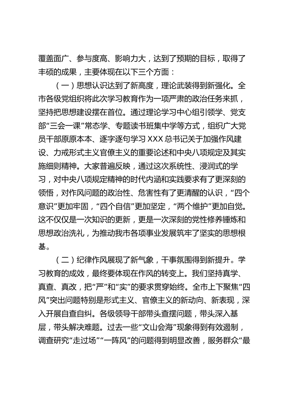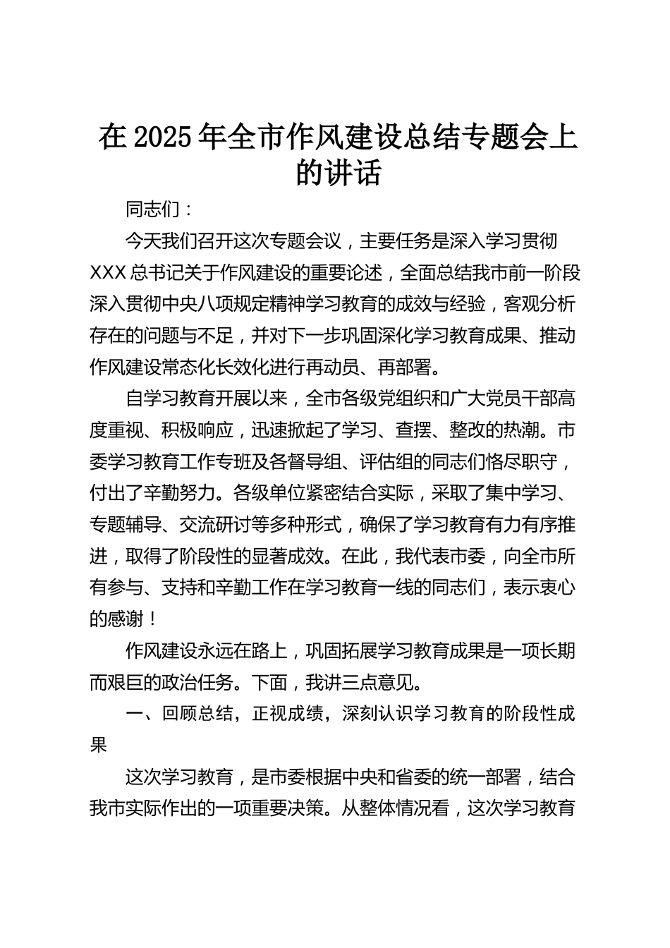 在2025年全市作風建設總結專題會上的講話同志們:今天我們召開這次專題會議,主要任務是深入學習貫徹XXX總書記關于作風建設的重要論述,全面總結我市前一階段深入貫徹中央八項規(guī)定精神學習教育的成效與經(jīng)驗,客觀分析存在的問題與不足,并對下一步鞏固深化學習教育成果、推動作風建設常態(tài)化長效化進行再動員、再部署。自學習教育開展以來,全市各級黨組織和廣大黨員干部高度重視、積極響應,迅速掀起了學習、查擺、整改的熱潮。市委學習教育工作專班及各督導組、評估組的同志們恪盡職守,付出了辛勤努力。各級單位緊密結合實際,采取了集中學習、專題輔導、交流研討等多...