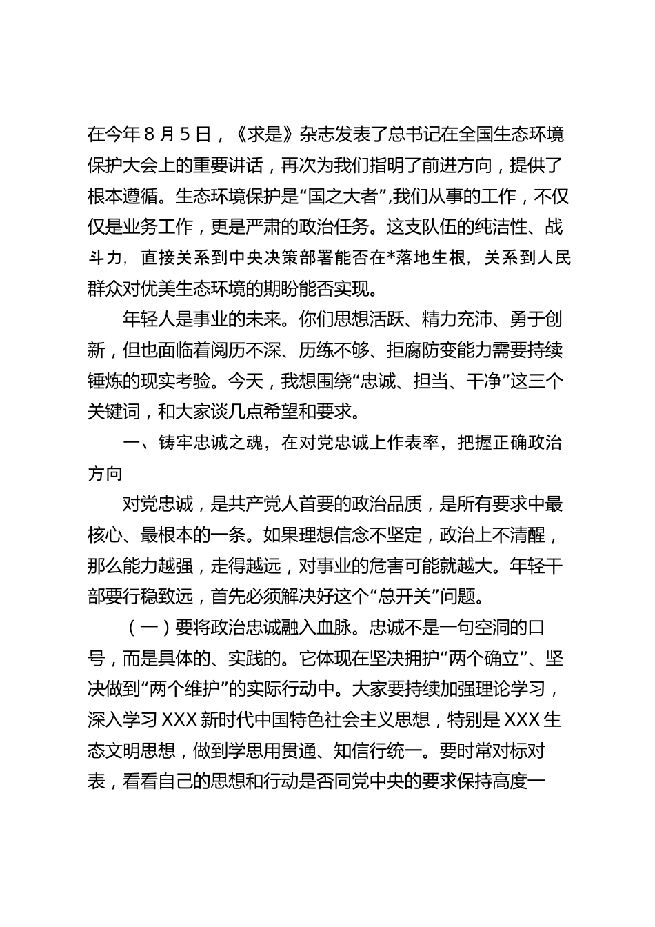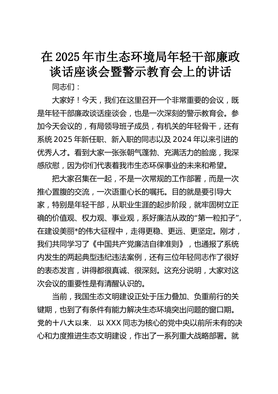 在2025年市生態(tài)環(huán)境局年輕干部廉政談話座談會暨警示教育會上的講話同志們:大家好!今天,我們在這里召開一個非常重要的會議,既是年輕干部廉政談話座談會,也是一次深刻的警示教育會。參加今天會議的,有局領導班子成員,有機關的年輕骨干,還有系統(tǒng)2025年新任職、新入職的同志以及2024年以來引進的優(yōu)秀人才??吹酱蠹乙粡垙埑瘹馀畈?、充滿活力的臉龐,我深感欣慰,因為你們代表著我市生態(tài)環(huán)保事業(yè)的未來和希望。把大家召集在一起,不是一次常規(guī)的工作部署,而是一次推心置腹的交流,一次語重心長的囑托。目的就是要引導大家,特別是年輕干部,從職業(yè)生涯的起步階段,就...