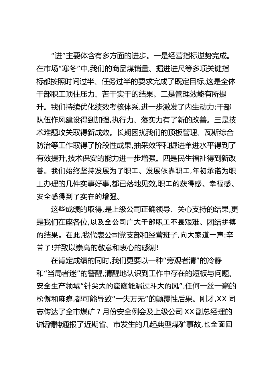 在XX公司2025年第三季度安委會上(擴(kuò)大)的講話同志們:今天,我們在這里召開公司2025年第三季度安委會(擴(kuò)大)會議,主要任務(wù)是深入貫徹上級公司三季度安委會的精神,全面總結(jié)我們上半年在安全生產(chǎn)經(jīng)營方面取得的成績與存在的不足,深刻剖析當(dāng)前面臨的嚴(yán)峻形勢與挑戰(zhàn),并對三季度及下一階段的重點工作進(jìn)行系統(tǒng)部署和周密安排。這次會議,既是一次回顧總“”結(jié)、查漏補(bǔ)缺的復(fù)盤會,“更是一次認(rèn)清形勢、加壓奮進(jìn)的動”員會。下面,我講三點意見。一、客觀審視上半年工作:成績與不足并存,根基與短板同在今年以來,面對煤炭市場深度調(diào)整和安全生產(chǎn)壓力持續(xù)加大的雙重考驗,公司上下同心同...