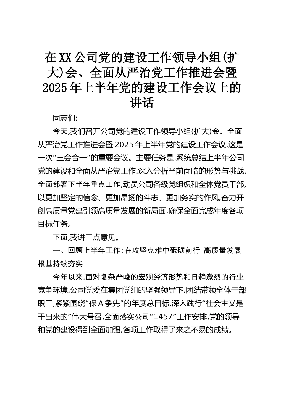 在XX公司黨的建設(shè)工作領(lǐng)導(dǎo)小組(擴(kuò)大)會(huì)、全面從嚴(yán)治黨工作推進(jìn)會(huì)暨2025年上半年黨的建設(shè)工作會(huì)議上的講話