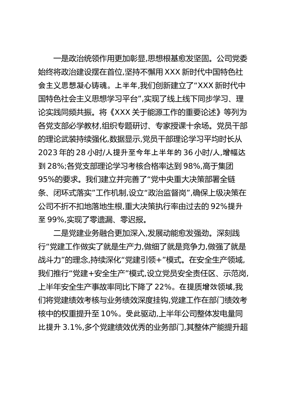 在XX公司黨的建設(shè)工作領(lǐng)導(dǎo)小組(擴(kuò)大)會(huì)、全面從嚴(yán)治黨工作推進(jìn)會(huì)暨2025年上半年黨的建設(shè)工作會(huì)議上的講話同志們:今天,我們召開公司黨的建設(shè)工作領(lǐng)導(dǎo)小組(擴(kuò)大)會(huì)、全面從嚴(yán)治黨工作推進(jìn)會(huì)暨2025年上半年黨的建設(shè)工作會(huì)議,這是“”一次三會(huì)合一的重要會(huì)議。主要任務(wù)是,系統(tǒng)總結(jié)上半年公司黨的建設(shè)和全面從嚴(yán)治黨工作,深入分析當(dāng)前面臨的形勢(shì)與挑戰(zhàn),全面部署下半年重點(diǎn)工作,動(dòng)員公司各級(jí)黨組織和全體黨員干部,以更加堅(jiān)定的信念、更加昂揚(yáng)的斗志、更加務(wù)實(shí)的作風(fēng),奮力開創(chuàng)高質(zhì)量黨建引領(lǐng)高質(zhì)量發(fā)展的新局面,確保全面完成年度各項(xiàng)目標(biāo)任務(wù)。下面,我講三點(diǎn)意見。一、回顧上半...