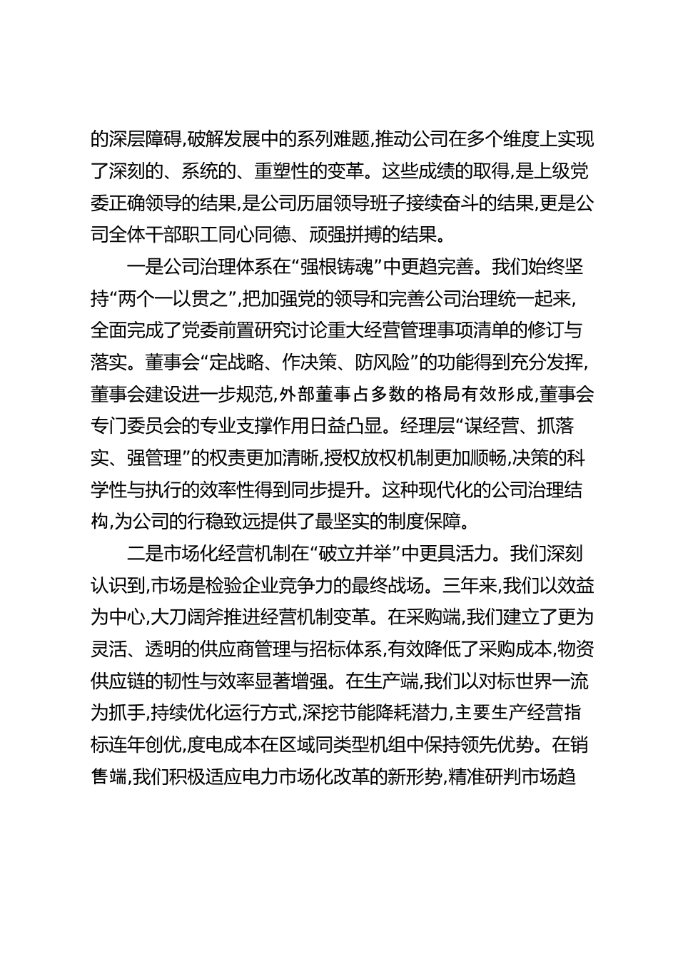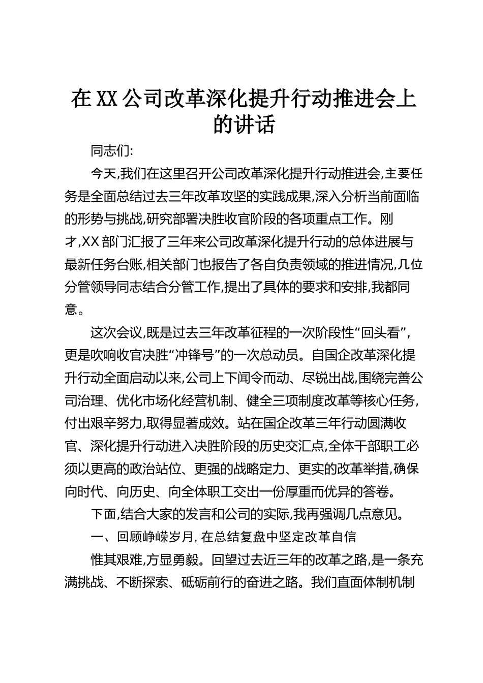 在XX公司改革深化提升行動推進(jìn)會上的講話同志們:今天,我們在這里召開公司改革深化提升行動推進(jìn)會,主要任務(wù)是全面總結(jié)過去三年改革攻堅(jiān)的實(shí)踐成果,深入分析當(dāng)前面臨的形勢與挑戰(zhàn),研究部署決勝收官階段的各項(xiàng)重點(diǎn)工作。剛才,XX部門匯報(bào)了三年來公司改革深化提升行動的總體進(jìn)展與最新任務(wù)臺賬,相關(guān)部門也報(bào)告了各自負(fù)責(zé)領(lǐng)域的推進(jìn)情況,幾位分管領(lǐng)導(dǎo)同志結(jié)合分管工作,提出了具體的要求和安排,我都同意。這次會議,“”既是過去三年改革征程的一次階段性回頭看,“”更是吹響收官決勝沖鋒號的一次總動員。自國企改革深化提升行動全面啟動以來,公司上下聞令而動、盡銳出戰(zhàn),圍繞完...