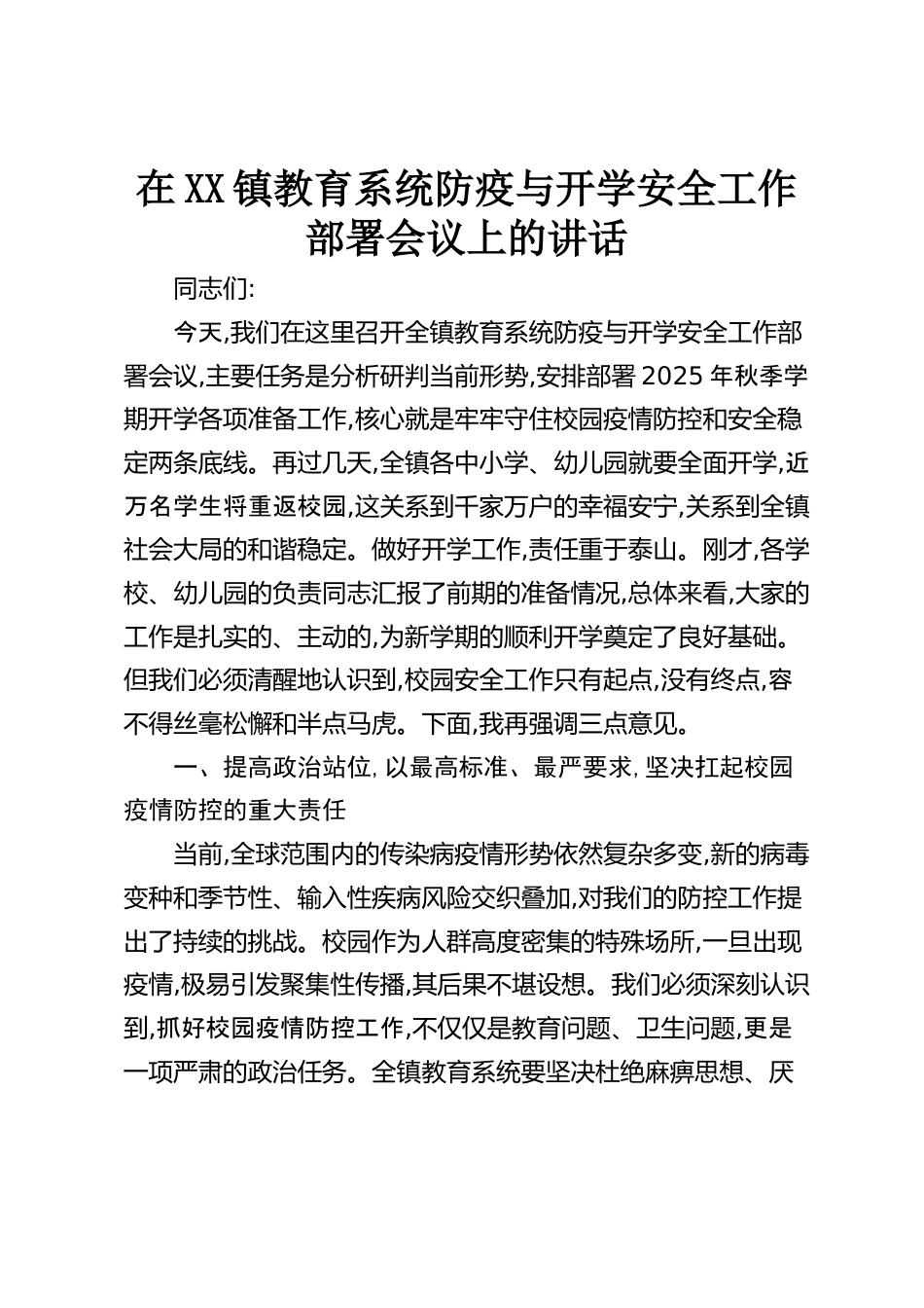在XX鎮(zhèn)教育系統(tǒng)防疫與開學安全工作部署會議上的講話同志們:今天,我們在這里召開全鎮(zhèn)教育系統(tǒng)防疫與開學安全工作部署會議,主要任務是分析研判當前形勢,安排部署2025年秋季學期開學各項準備工作,核心就是牢牢守住校園疫情防控和安全穩(wěn)定兩條底線。再過幾天,全鎮(zhèn)各中小學、幼兒園就要全面開學,近萬名學生將重返校園,這關系到千家萬戶的幸福安寧,關系到全鎮(zhèn)社會大局的和諧穩(wěn)定。做好開學工作,責任重于泰山。剛才,各學校、幼兒園的負責同志匯報了前期的準備情況,總體來看,大家的工作是扎實的、主動的,為新學期的順利開學奠定了良好基礎。但我們必須清醒地認識到,校園安全工作...