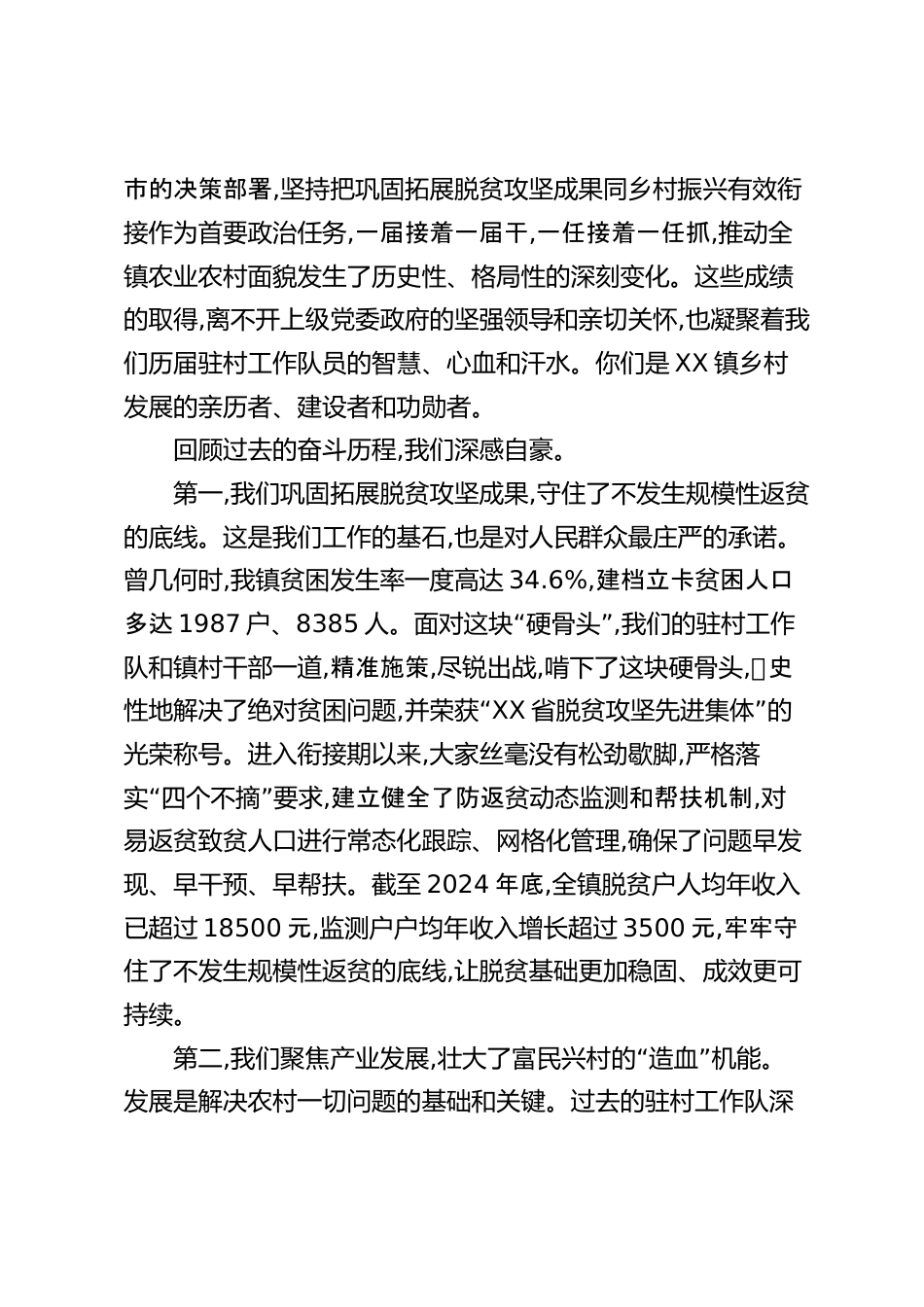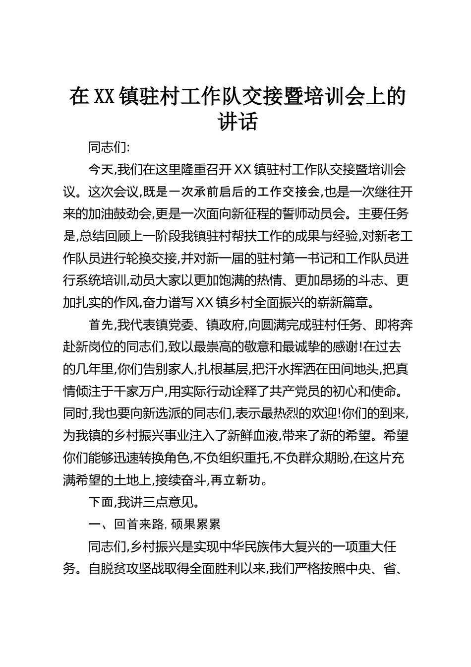 在XX鎮(zhèn)駐村工作隊(duì)交接暨培訓(xùn)會(huì)上的講話同志們:今天,我們?cè)谶@里隆重召開(kāi)XX鎮(zhèn)駐村工作隊(duì)交接暨培訓(xùn)會(huì)議。這次會(huì)議,既是一次承前啟后的工作交接會(huì),也是一次繼往開(kāi)來(lái)的加油鼓勁會(huì),更是一次面向新征程的誓師動(dòng)員會(huì)。主要任務(wù)是,總結(jié)回顧上一階段我鎮(zhèn)駐村幫扶工作的成果與經(jīng)驗(yàn),對(duì)新老工作隊(duì)員進(jìn)行輪換交接,并對(duì)新一屆的駐村第一書(shū)記和工作隊(duì)員進(jìn)行系統(tǒng)培訓(xùn),動(dòng)員大家以更加飽滿(mǎn)的熱情、更加昂揚(yáng)的斗志、更加扎實(shí)的作風(fēng),奮力譜寫(xiě)XX鎮(zhèn)鄉(xiāng)村全面振興的嶄新篇章。首先,我代表鎮(zhèn)黨委、鎮(zhèn)政府,向圓滿(mǎn)完成駐村任務(wù)、即將奔赴新崗位的同志們,致以最崇高的敬意和最誠(chéng)摯的感謝!在過(guò)去的幾年...