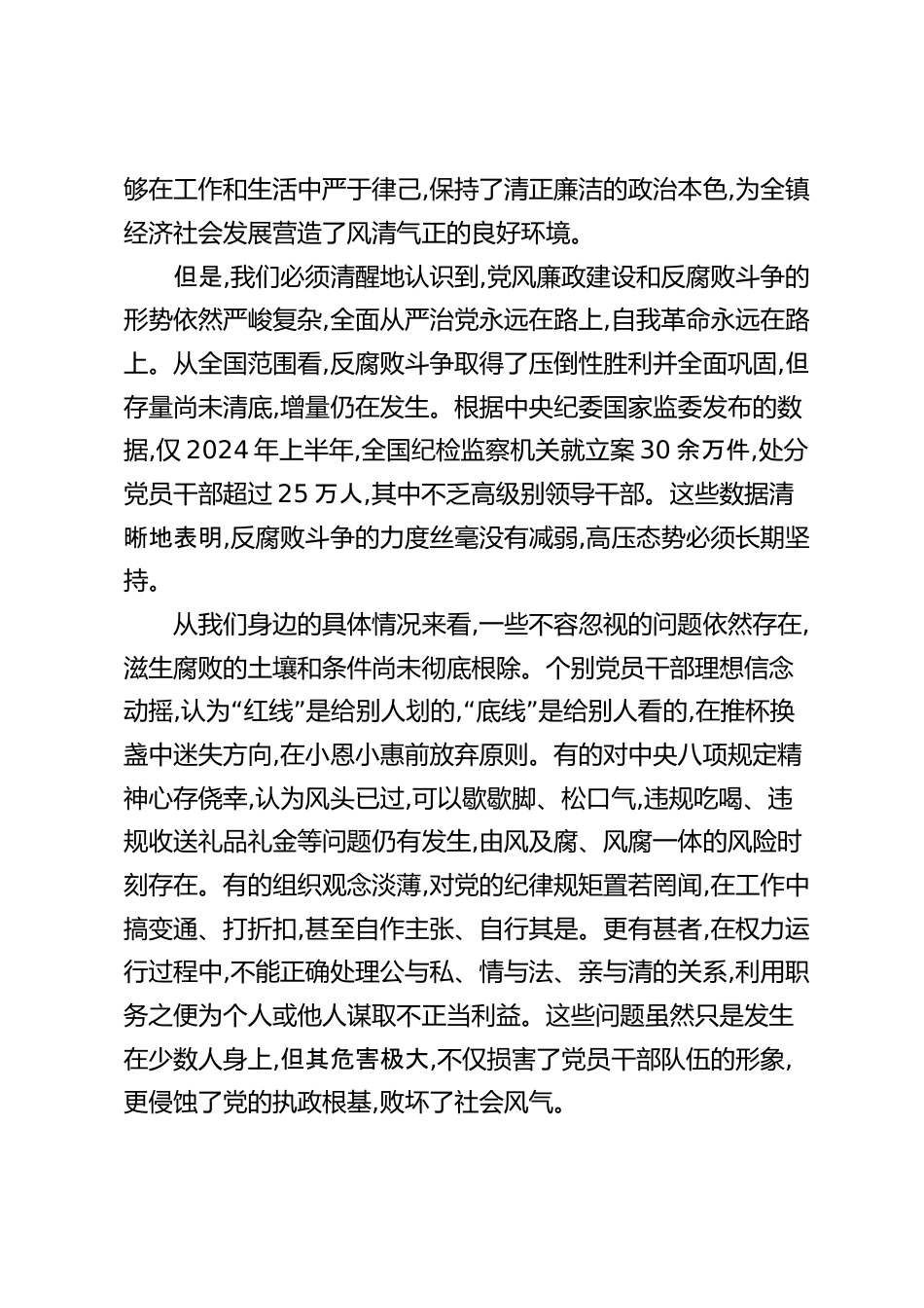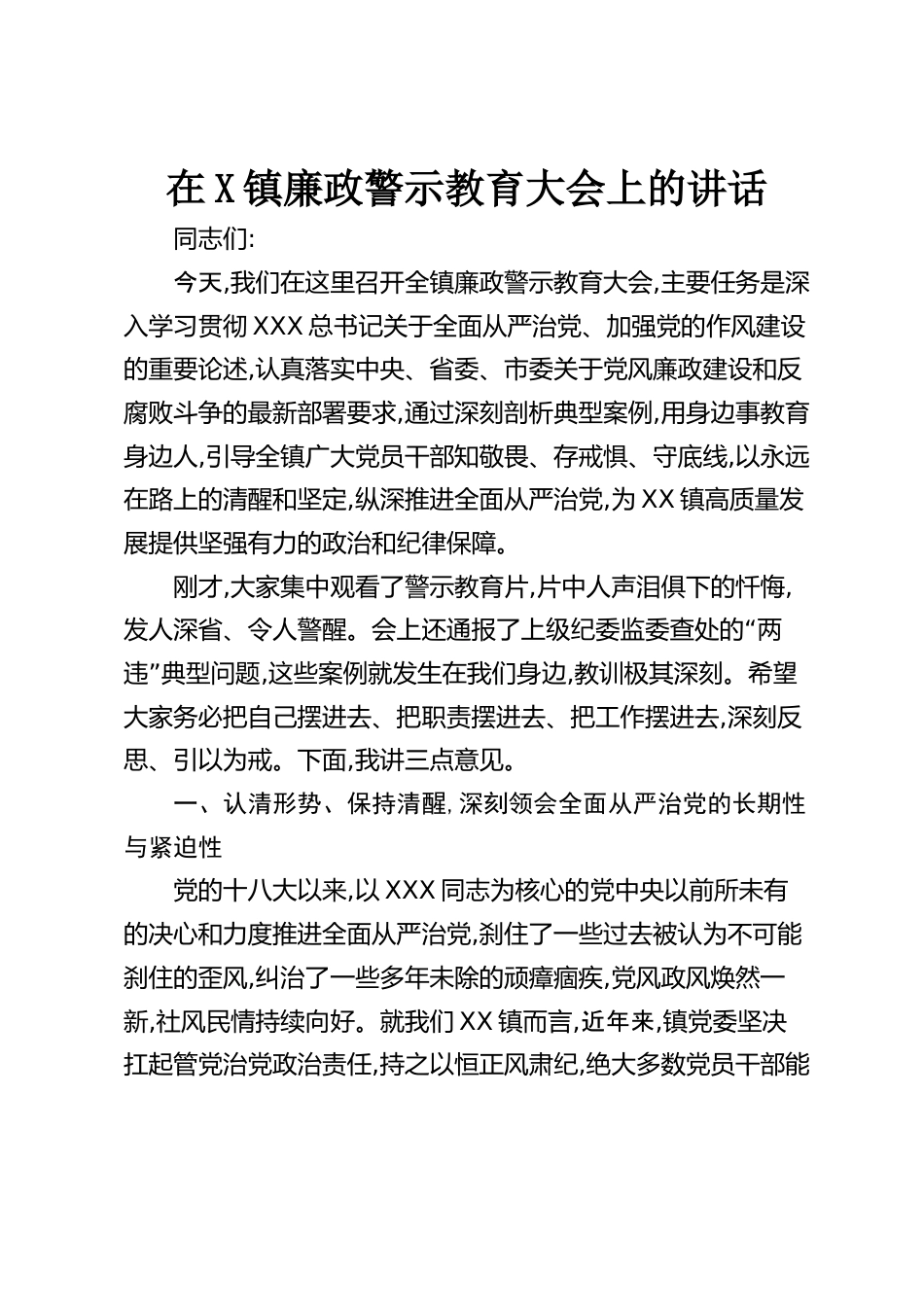在X鎮(zhèn)廉政警示教育大會(huì)上的講話同志們:今天,我們?cè)谶@里召開全鎮(zhèn)廉政警示教育大會(huì),主要任務(wù)是深入學(xué)習(xí)貫徹XXX總書記關(guān)于全面從嚴(yán)治黨、加強(qiáng)黨的作風(fēng)建設(shè)的重要論述,認(rèn)真落實(shí)中央、省委、市委關(guān)于黨風(fēng)廉政建設(shè)和反腐敗斗爭(zhēng)的最新部署要求,通過深刻剖析典型案例,用身邊事教育身邊人,引導(dǎo)全鎮(zhèn)廣大黨員干部知敬畏、存戒懼、守底線,以永遠(yuǎn)在路上的清醒和堅(jiān)定,縱深推進(jìn)全面從嚴(yán)治黨,為XX鎮(zhèn)高質(zhì)量發(fā)展提供堅(jiān)強(qiáng)有力的政治和紀(jì)律保障。剛才,大家集中觀看了警示教育片,片中人聲淚俱下的懺悔,“發(fā)人深省、令人警醒。會(huì)上還通報(bào)了上級(jí)紀(jì)委監(jiān)委查處的兩”違典型問題,這些案例就發(fā)生在我...