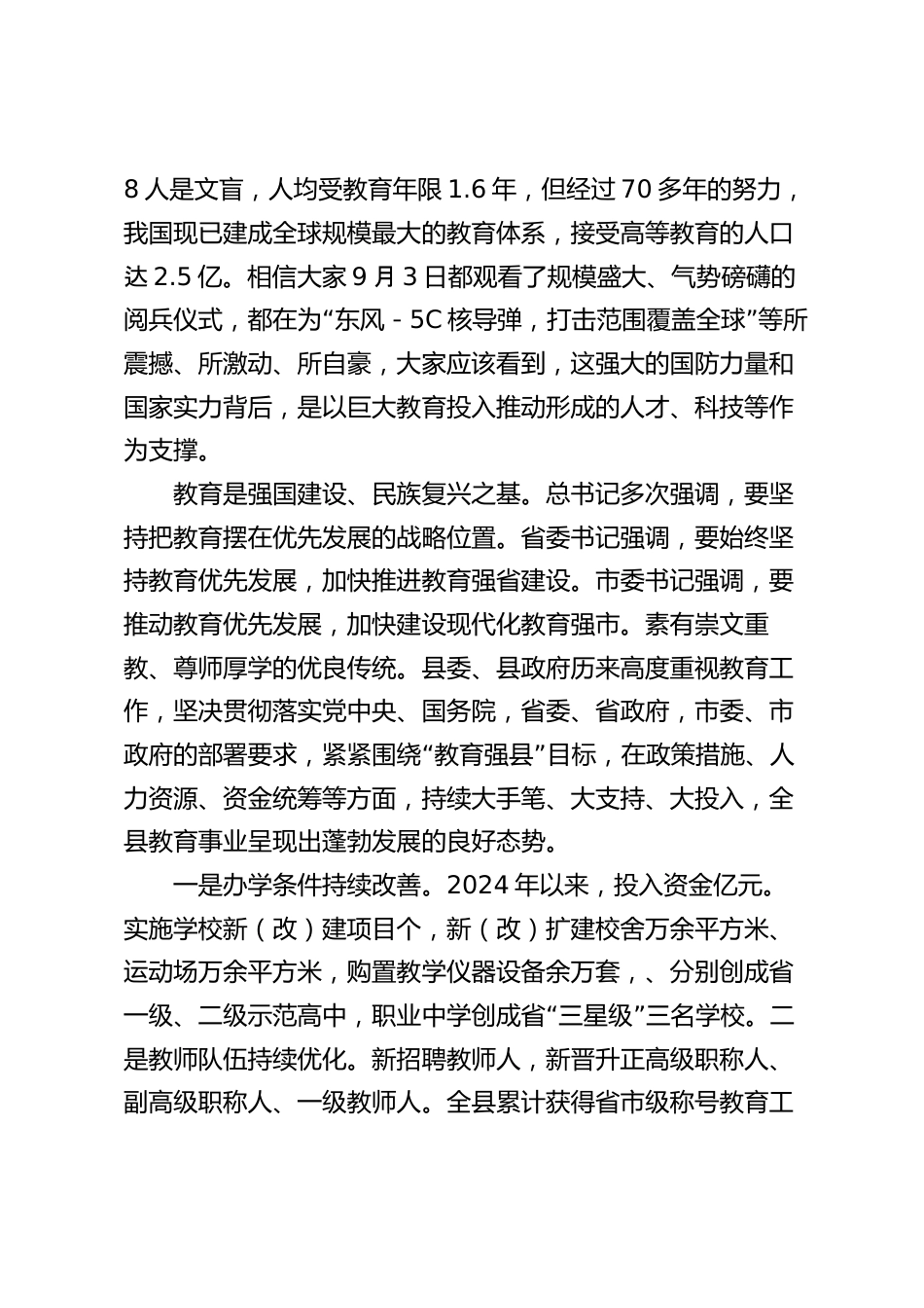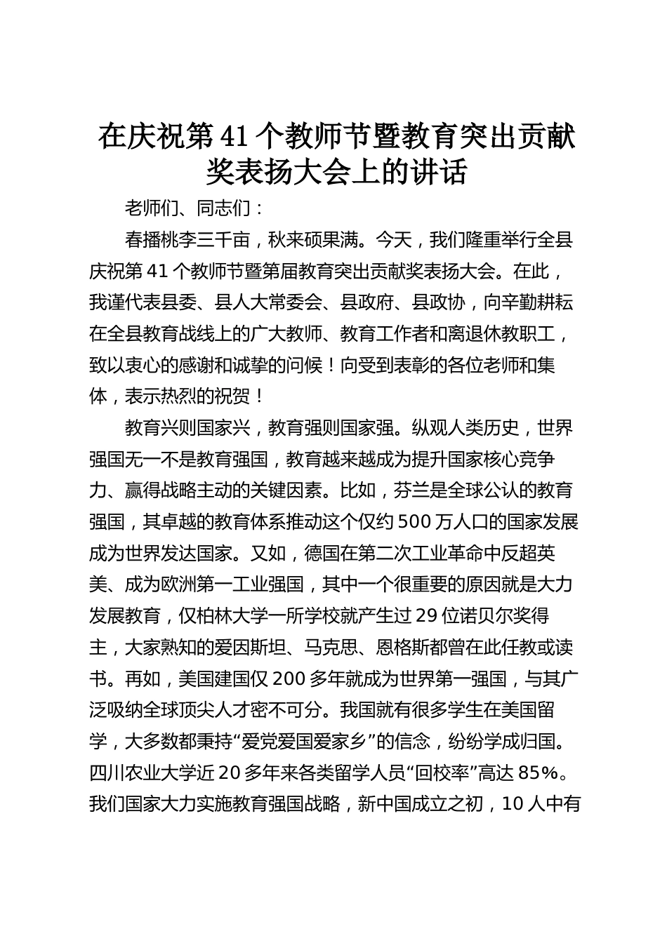 在慶祝第41個教師節(jié)暨教育突出貢獻(xiàn)獎表揚(yáng)大會上的講話老師們、同志們:春播桃李三千畝,秋來碩果滿。今天,我們隆重舉行全縣慶祝第41個教師節(jié)暨第屆教育突出貢獻(xiàn)獎表揚(yáng)大會。在此,我謹(jǐn)代表縣委、縣人大常委會、縣政府、縣政協(xié),向辛勤耕耘在全縣教育戰(zhàn)線上的廣大教師、教育工作者和離退休教職工,致以衷心的感謝和誠摯的問候!向受到表彰的各位老師和集體,表示熱烈的祝賀!教育興則國家興,教育強(qiáng)則國家強(qiáng)。縱觀人類歷史,世界強(qiáng)國無一不是教育強(qiáng)國,教育越來越成為提升國家核心競爭力、贏得戰(zhàn)略主動的關(guān)鍵因素。比如,芬蘭是全球公認(rèn)的教育強(qiáng)國,其卓越的教育體系推動...