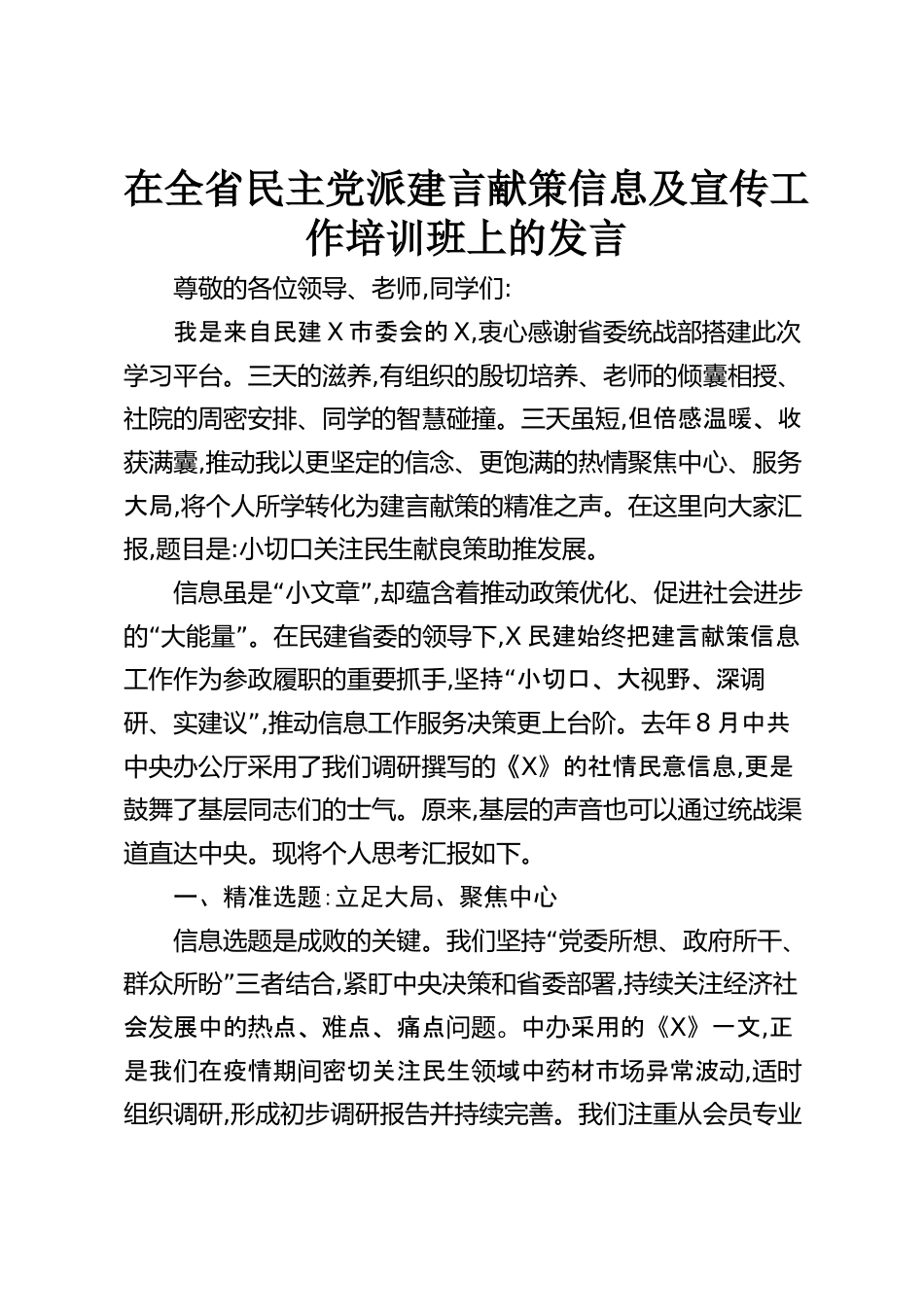 在全省民主黨派建言獻(xiàn)策信息及宣傳工作培訓(xùn)班上的發(fā)言尊敬的各位領(lǐng)導(dǎo)、老師,同學(xué)們:我是來(lái)自民建X市委會(huì)的X,衷心感謝省委統(tǒng)戰(zhàn)部搭建此次學(xué)習(xí)平臺(tái)。三天的滋養(yǎng),有組織的殷切培養(yǎng)、老師的傾囊相授、社院的周密安排、同學(xué)的智慧碰撞。三天雖短,但倍感溫暖、收獲滿囊,推動(dòng)我以更堅(jiān)定的信念、更飽滿的熱情聚焦中心、服務(wù)大局,將個(gè)人所學(xué)轉(zhuǎn)化為建言獻(xiàn)策的精準(zhǔn)之聲。在這里向大家匯報(bào),題目是:小切口關(guān)注民生獻(xiàn)良策助推發(fā)展?!啊毙畔㈦m是小文章,卻蘊(yùn)含著推動(dòng)政策優(yōu)化、促進(jìn)社會(huì)進(jìn)步“”的大能量。在民建省委的領(lǐng)導(dǎo)下,X民建始把建言獻(xiàn)策信息終工作作為參政履職的重要抓手,“持小...