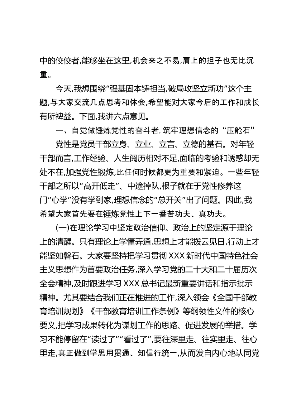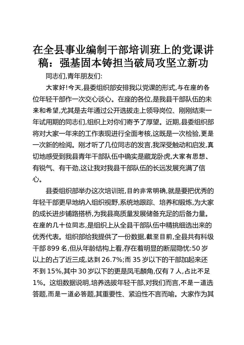 在全縣事業(yè)編制干部培訓(xùn)班上的黨課講稿:強(qiáng)基固本鑄擔(dān)當(dāng)破局攻堅(jiān)立新功同志們,青年朋友們:大家好!今天,縣委組織部安排我以黨課的形式,與在座的各位年輕干部作一次交心談心。在座的各位,是我縣干部隊(duì)伍的未來(lái)和希望,尤其是去年通過公開選拔走上領(lǐng)導(dǎo)崗位、剛剛結(jié)束一年試用期的同志們,組織上對(duì)你們寄予了厚望。近期,縣委組織部將對(duì)大家一年來(lái)的工作表現(xiàn)進(jìn)行全面考核,這既是一次檢驗(yàn),更是一次新的檢閱。剛才聽了幾位同志的發(fā)言,我深受觸動(dòng)和啟發(fā),真切地感受到我縣青年干部隊(duì)伍中確實(shí)是藏龍臥虎,大家有思想、有銳氣、有干勁,這讓我對(duì)我縣干部隊(duì)伍的長(zhǎng)遠(yuǎn)發(fā)展充滿了信心??h委...
