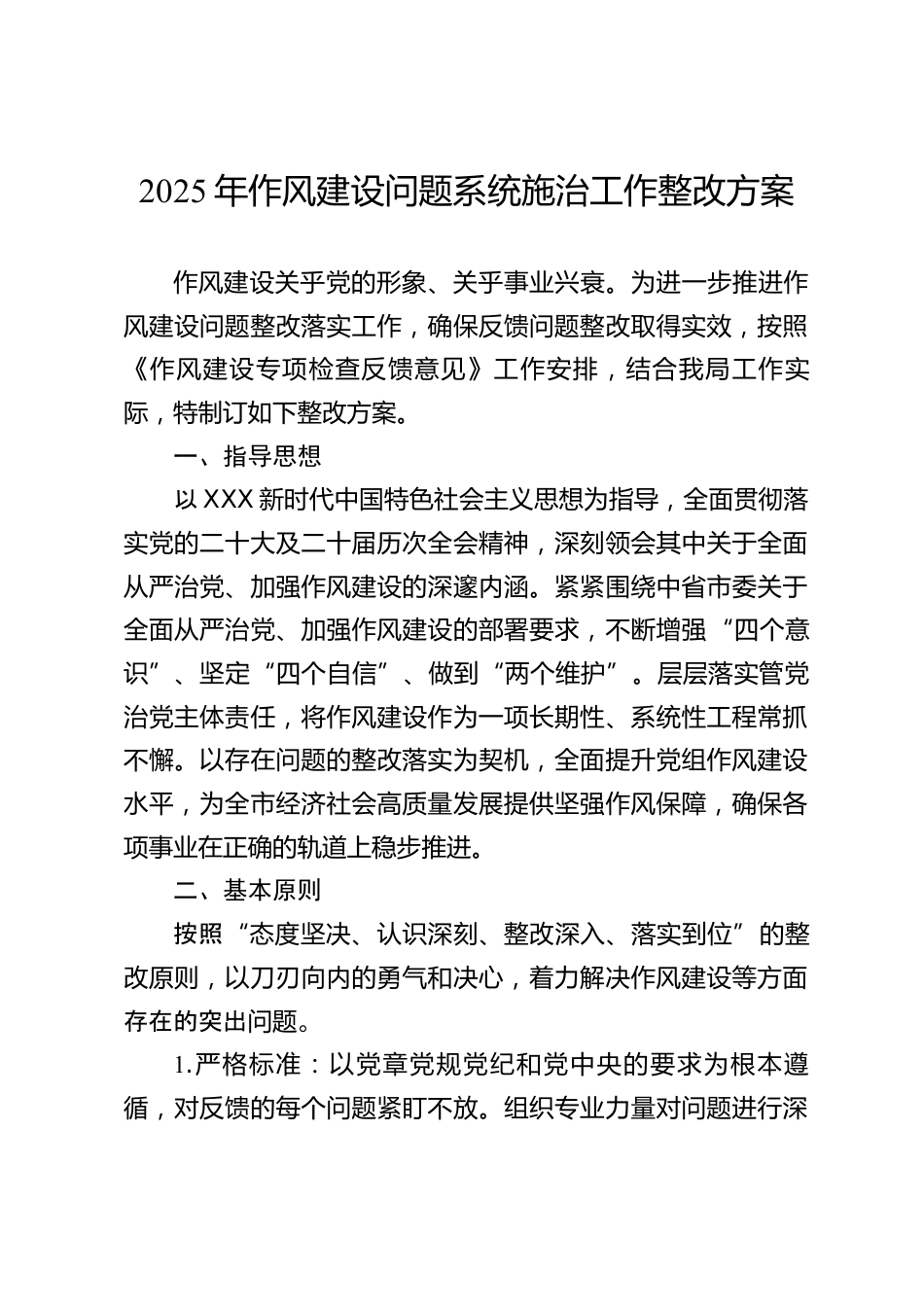 2025年作風建設問題系統(tǒng)施治工作整改方案作風建設關乎黨的形象、關乎事業(yè)興衰。為進一步推進作風建設問題整改落實工作,確保反饋問題整改取得實效,按照《作風建設專項檢查反饋意見》工作安排,結合我局工作實際,特制訂如下整改方案。一、指導思想以XXX新時代中國特色社會主義思想為指導,全面貫徹落實黨的二十大及二十屆歷次全會精神,深刻領會其中關于全面從嚴治黨、加強作風建設的深邃內(nèi)涵。緊緊圍繞中省市委關于全面從嚴治黨、加強作風建設的部署要求,不斷增強“四個意識”、堅定“四個自信”、做到“兩個維護”。層層落實管黨治黨主體責任,將作風建設作為一項長...