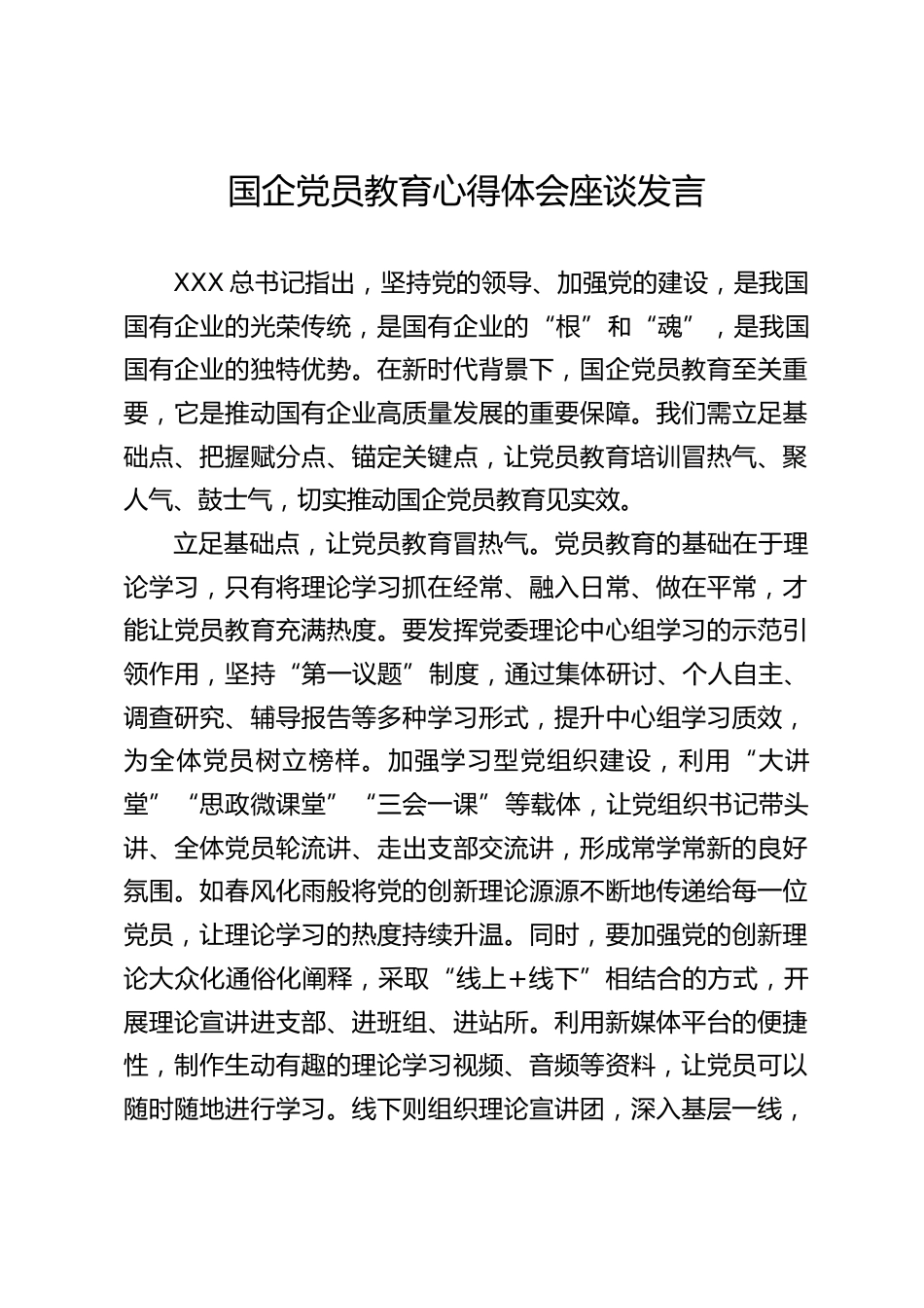 國企黨員教育心得體會座談發(fā)言XXX總書記指出,堅持黨的領(lǐng)導(dǎo)、加強黨的建設(shè),是我國國有企業(yè)的光榮傳統(tǒng),是國有企業(yè)的“根”和“魂”,是我國國有企業(yè)的獨特優(yōu)勢。在新時代背景下,國企黨員教育至關(guān)重要,它是推動國有企業(yè)高質(zhì)量發(fā)展的重要保障。我們需立足基礎(chǔ)點、把握賦分點、錨定關(guān)鍵點,讓黨員教育培訓(xùn)冒熱氣、聚人氣、鼓士氣,切實推動國企黨員教育見實效。立足基礎(chǔ)點,讓黨員教育冒熱氣。黨員教育的基礎(chǔ)在于理論學(xué)習(xí),只有將理論學(xué)習(xí)抓在經(jīng)常、融入日常、做在平常,才能讓黨員教育充滿熱度。要發(fā)揮黨委理論中心組學(xué)習(xí)的示范引領(lǐng)作用,堅持“第一議題”制度,通過集...