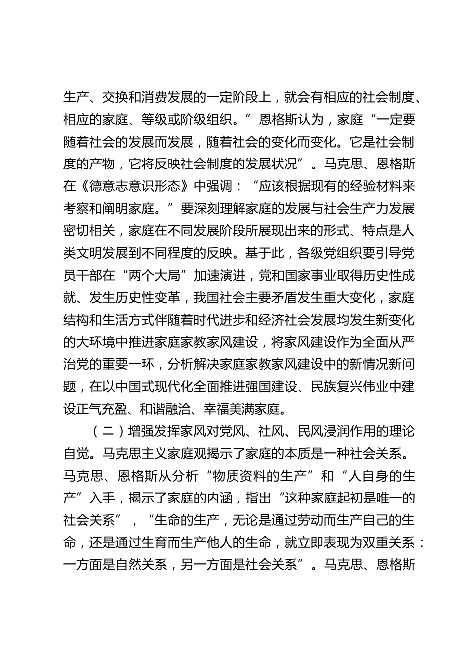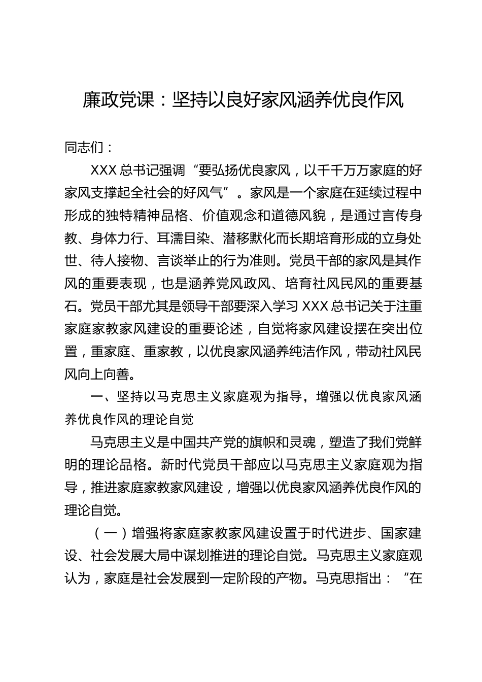 廉政黨課:堅持以良好家風(fēng)涵養(yǎng)優(yōu)良作風(fēng)同志們:XXX總書記強(qiáng)調(diào)“要弘揚(yáng)優(yōu)良家風(fēng),以千千萬萬家庭的好家風(fēng)支撐起全社會的好風(fēng)氣”。家風(fēng)是一個家庭在延續(xù)過程中形成的獨(dú)特精神品格、價值觀念和道德風(fēng)貌,是通過言傳身教、身體力行、耳濡目染、潛移默化而長期培育形成的立身處世、待人接物、言談舉止的行為準(zhǔn)則。黨員干部的家風(fēng)是其作風(fēng)的重要表現(xiàn),也是涵養(yǎng)黨風(fēng)政風(fēng)、培育社風(fēng)民風(fēng)的重要基石。黨員干部尤其是領(lǐng)導(dǎo)干部要深入學(xué)習(xí)XXX總書記關(guān)于注重家庭家教家風(fēng)建設(shè)的重要論述,自覺將家風(fēng)建設(shè)擺在突出位置,重家庭、重家教,以優(yōu)良家風(fēng)涵養(yǎng)純潔作風(fēng),帶動社風(fēng)民風(fēng)向上向善。...