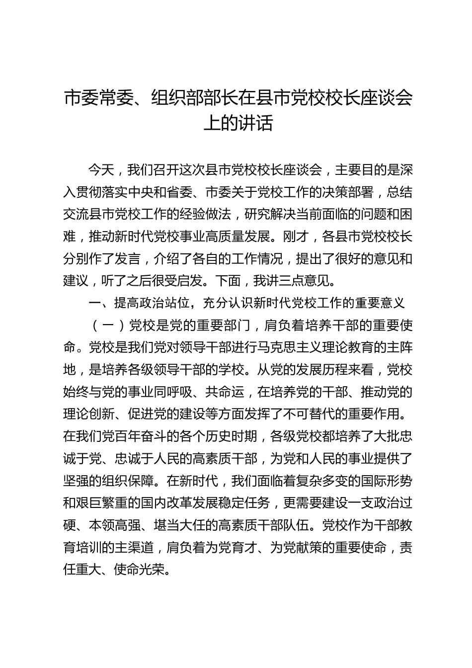 市委常委、組織部部長在縣市黨校校長座談會上的講話今天,我們召開這次縣市黨校校長座談會,主要目的是深入貫徹落實(shí)中央和省委、市委關(guān)于黨校工作的決策部署,總結(jié)交流縣市黨校工作的經(jīng)驗(yàn)做法,研究解決當(dāng)前面臨的問題和困難,推動新時(shí)代黨校事業(yè)高質(zhì)量發(fā)展。剛才,各縣市黨校校長分別作了發(fā)言,介紹了各自的工作情況,提出了很好的意見和建議,聽了之后很受啟發(fā)。下面,我講三點(diǎn)意見。一、提高政治站位,充分認(rèn)識新時(shí)代黨校工作的重要意義(一)黨校是黨的重要部門,肩負(fù)著培養(yǎng)干部的重要使命。黨校是我們黨對領(lǐng)導(dǎo)干部進(jìn)行馬克思主義理論教育的主陣地,是培養(yǎng)各級領(lǐng)導(dǎo)干...