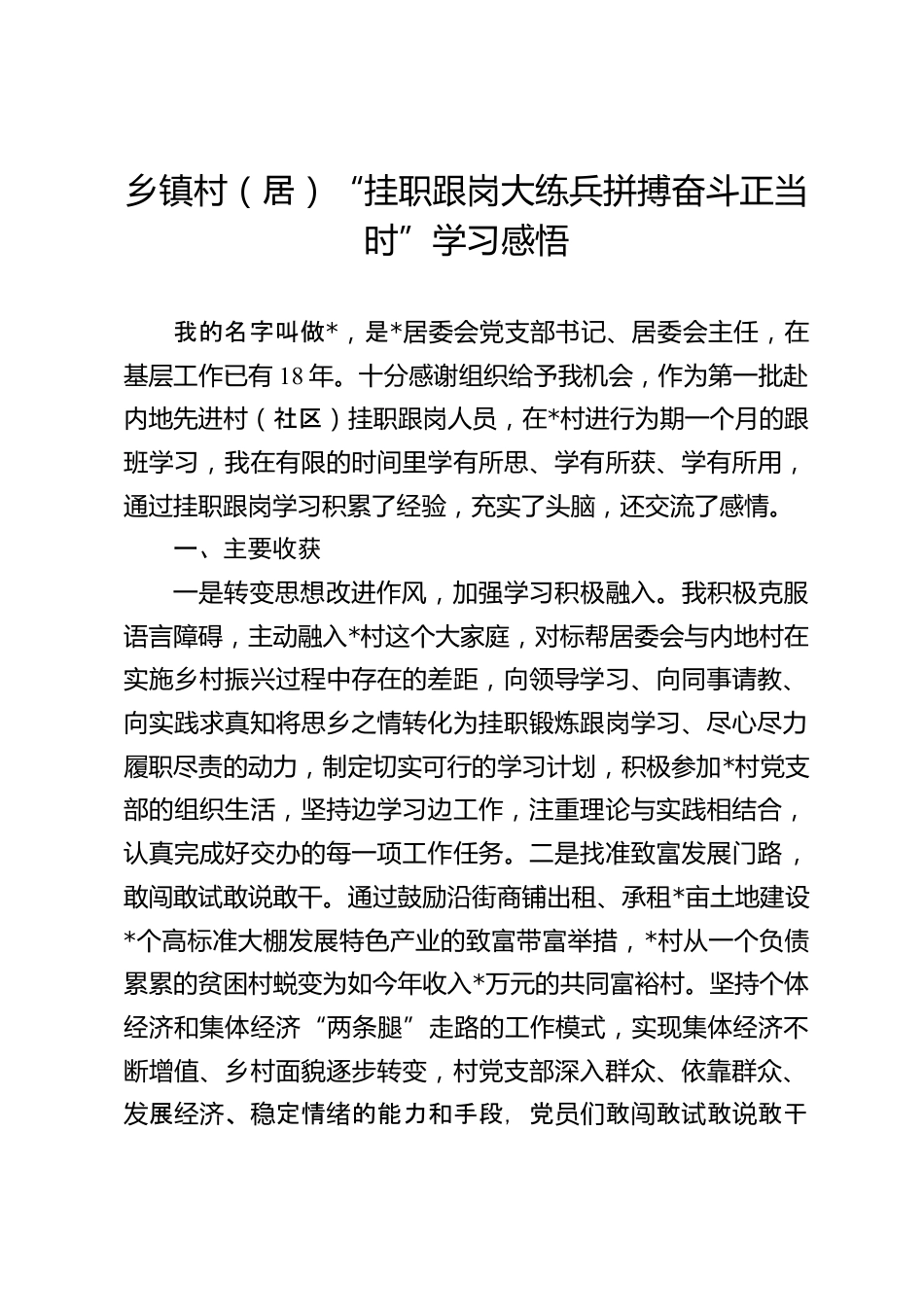 鄉(xiāng)鎮(zhèn)村(居)“掛職跟崗大練兵拼搏奮斗正當(dāng)時”學(xué)習(xí)感悟我的名字叫做*,是*居委會黨支部書記、居委會主任,在基層工作已有18年。十分感謝組織給予我機(jī)會,作為第一批赴內(nèi)地先進(jìn)村(社區(qū))掛職跟崗人員,在*村進(jìn)行為期一個月的跟班學(xué)習(xí),我在有限的時間里學(xué)有所思、學(xué)有所獲、學(xué)有所用,通過掛職跟崗學(xué)習(xí)積累了經(jīng)驗,充實了頭腦,還交流了感情。一、主要收獲一是轉(zhuǎn)變思想改進(jìn)作風(fēng),加強(qiáng)學(xué)習(xí)積極融入。我積極克服語言障礙,主動融入*村這個大家庭,對標(biāo)幫居委會與內(nèi)地村在實施鄉(xiāng)村振興過程中存在的差距,向領(lǐng)導(dǎo)學(xué)習(xí)、向同事請教、向?qū)嵺`求真知將思鄉(xiāng)之情轉(zhuǎn)化為掛職鍛煉跟崗...