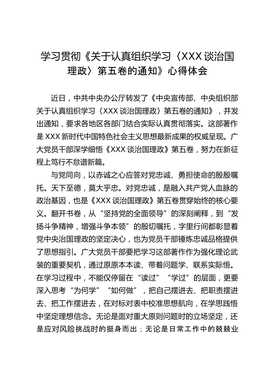 學(xué)習(xí)貫徹《關(guān)于認(rèn)真組織學(xué)習(xí)〈XXX談治國(guó)理政〉第五卷的通知》心得體會(huì)近日,中共中央辦公廳轉(zhuǎn)發(fā)了《中央宣傳部、中央組織部關(guān)于認(rèn)真組織學(xué)習(xí)〈XXX談治國(guó)理政〉第五卷的通知》,并發(fā)出通知,要求各地區(qū)各部門結(jié)合實(shí)際認(rèn)真貫徹落實(shí)。這部著作是XXX新時(shí)代中國(guó)特色社會(huì)主義思想最新成果的權(quán)威呈現(xiàn)。廣大黨員干部深學(xué)細(xì)悟《XXX談治國(guó)理政》第五卷,努力在新征程上篤行不怠譜新篇。與黨同向,以赤誠(chéng)之心應(yīng)答對(duì)黨忠誠(chéng)、勇?lián)姑囊笠髧谕?。天下至德,莫大乎忠。?duì)黨忠誠(chéng),是融入共產(chǎn)黨人血脈的政治基因,也是《XXX談治國(guó)理政》第五卷貫穿始終的核心要義。翻開書卷,從“堅(jiān)持黨...