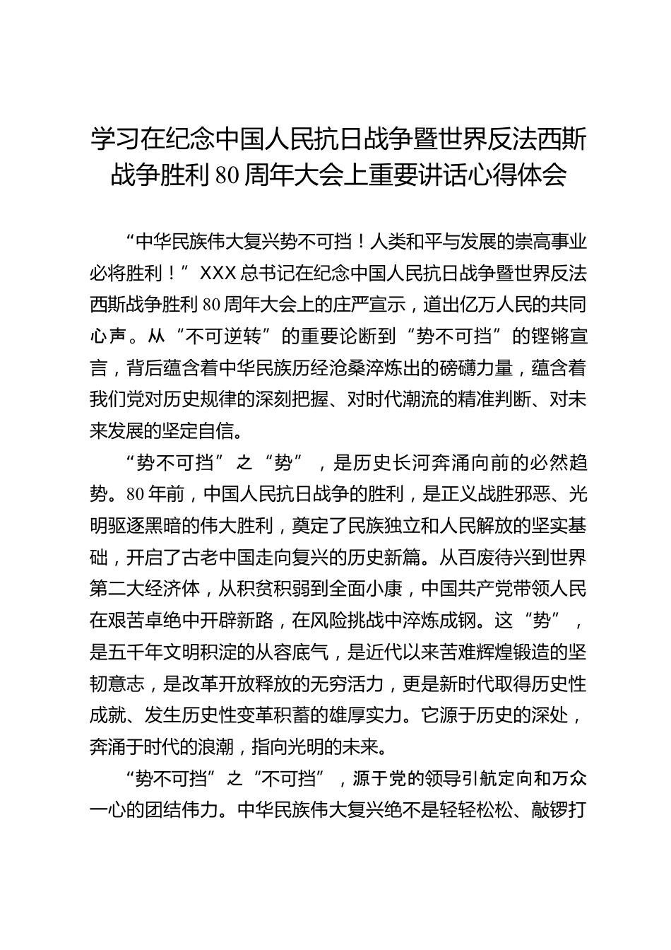 學(xué)習(xí)在紀(jì)念中國(guó)人民抗日戰(zhàn)爭(zhēng)暨世界反法西斯戰(zhàn)爭(zhēng)勝利80周年大會(huì)上重要講話心得體會(huì)