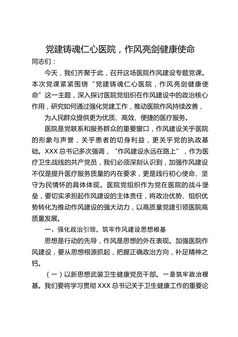 黨建鑄魂仁心醫(yī)院,作風(fēng)亮劍健康使命同志們:今天,我們齊聚于此,召開這場醫(yī)院作風(fēng)建設(shè)專題黨課。本次黨課緊緊圍繞“黨建鑄魂仁心醫(yī)院,作風(fēng)亮劍健康使命”這一主題,深入探討醫(yī)院黨組織在作風(fēng)建設(shè)中的政治核心作用,研究如何通過強(qiáng)化黨建工作,推動醫(yī)院作風(fēng)持續(xù)改善,為人民群眾提供更為優(yōu)質(zhì)、高效、便捷的醫(yī)療服務(wù)。醫(yī)院是黨聯(lián)系和服務(wù)群眾的重要窗口,作風(fēng)建設(shè)關(guān)乎醫(yī)院的形象與聲譽(yù),關(guān)乎患者的切身利益,更關(guān)乎黨的執(zhí)政基礎(chǔ)。XXX總書記多次強(qiáng)調(diào),“作風(fēng)建設(shè)永遠(yuǎn)在路上”,作為醫(yī)療衛(wèi)生戰(zhàn)線的共產(chǎn)黨員,我們必須深刻認(rèn)識到,加強(qiáng)作風(fēng)建設(shè)不僅是提升醫(yī)療服務(wù)質(zhì)量的內(nèi)...